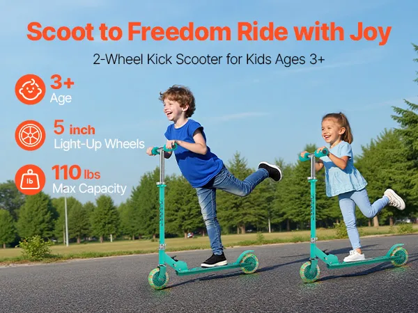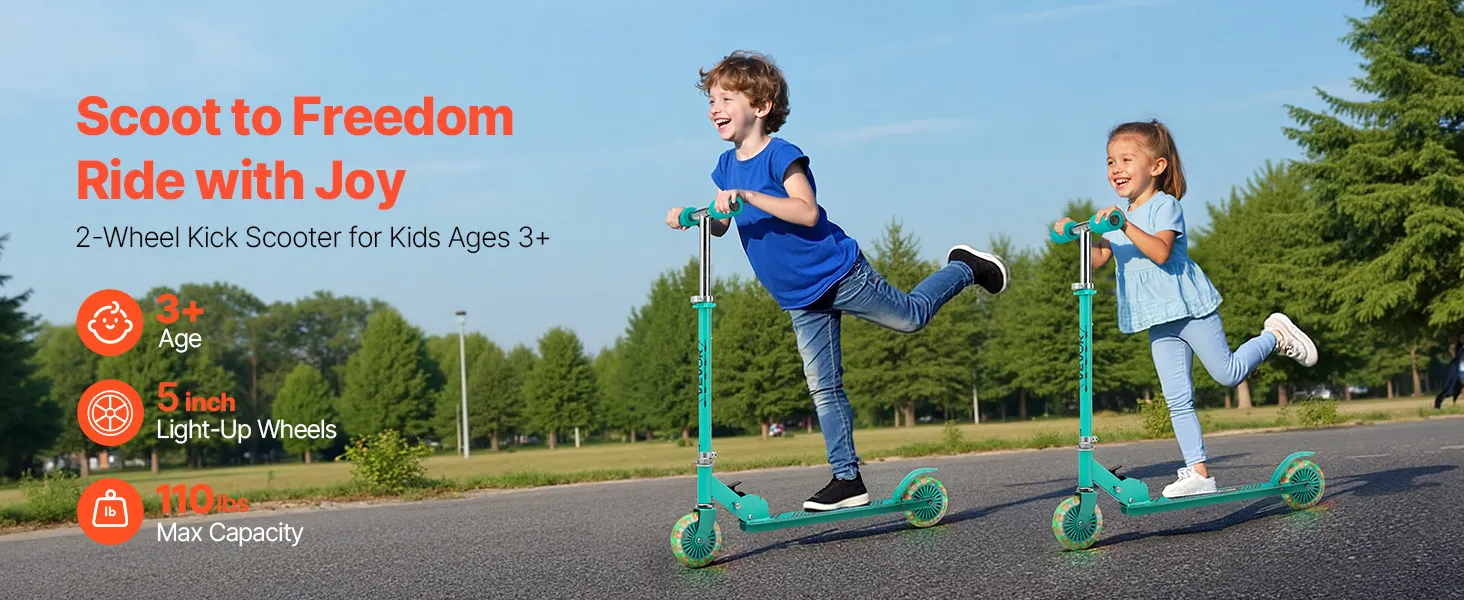 Kids Scooter for Ages 3+: This 2-wheel kick scooter for kids features an aluminum alloy frame—lightweight, durable, and capable of supporting up to 110 lbs. A fun and active companion that encourages outdoor play, confidence, and joy