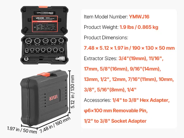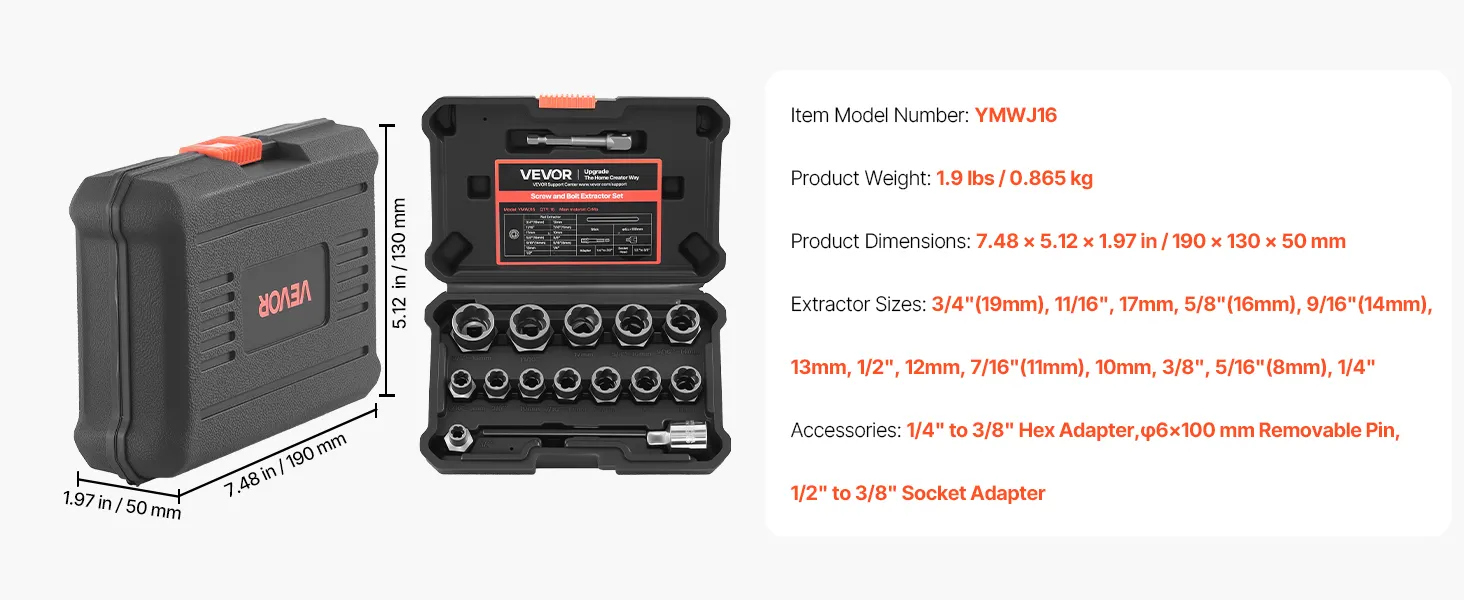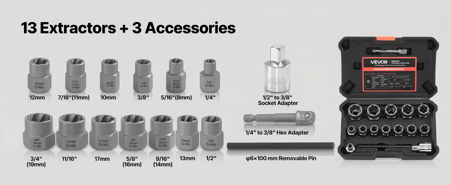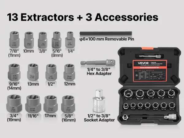 Complete Bolt Extractor Kit: Includes 13 extractors—3/4"(19 mm), 11/16", 17 mm, 5/8"(16 mm), 9/16"(14 mm), 13 mm, 1/2", 12 mm, 7/16"(11 mm), 10 mm, 3/8", 5/16"(8 mm), 1/4"—as well as a 1/4" to 3/8" adapter, a 6 mm pin punch, and a 1/2" to 3/8" adapter