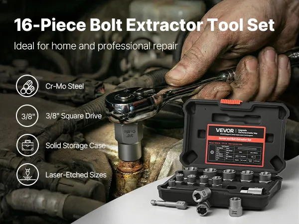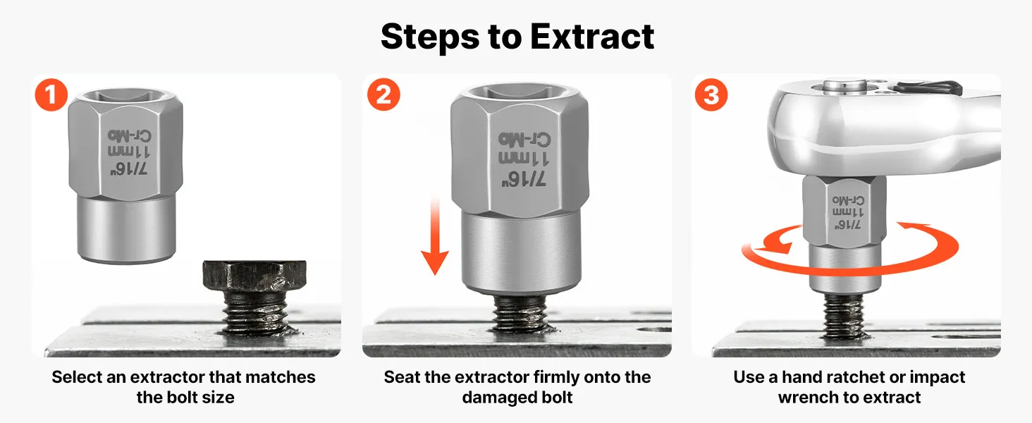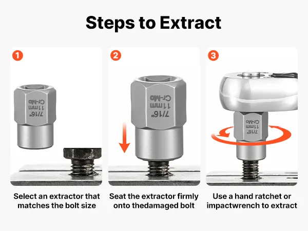 The straightforward removal method of the extractor socket set helps you stay in control, even with damaged or seized bolts.