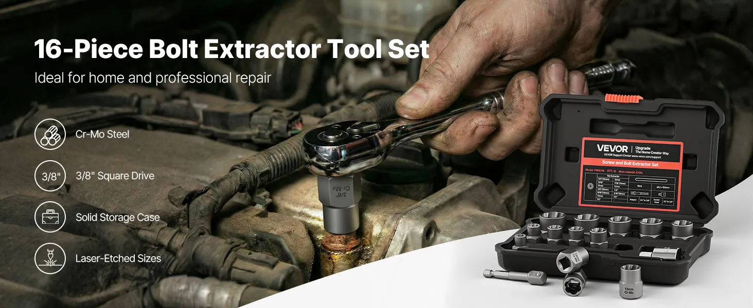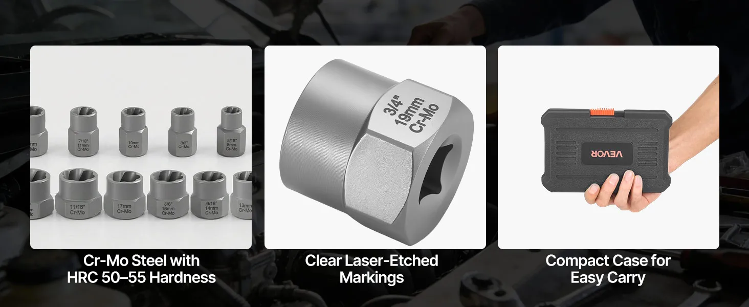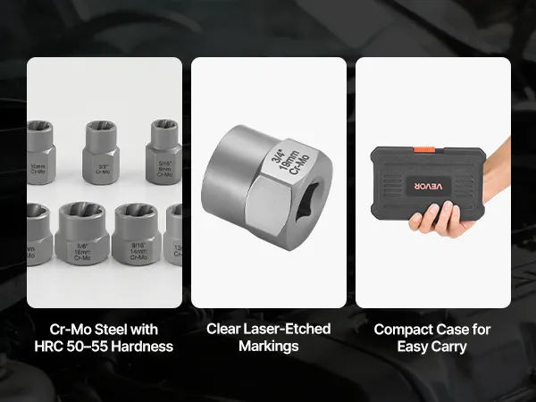 Built to Last: Made from high-quality Cr-Mo steel with HRC50-55 hardness, the bolt extractor set is designed to withstand wear, torsion, and deformation. It is ideal for frequent use in garages, workshops, and job sites where durability truly matters