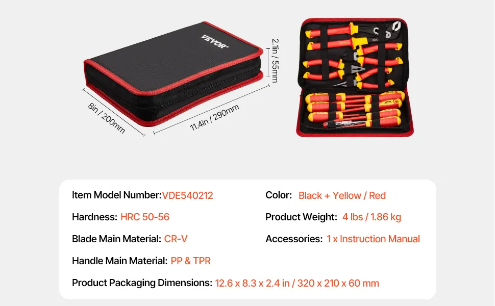 High Hardness and Durability: Crafted from CR-V material, this insulated tool set provides exceptional hardness and wear resistance. It also provides corrosion resistance in harsh environments, ensuring long-lasting durability