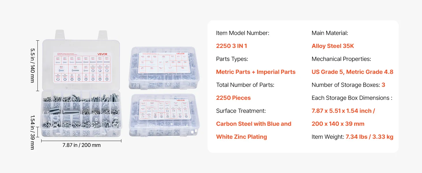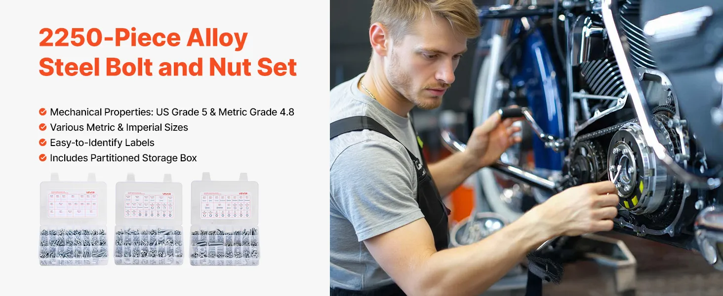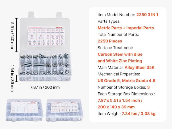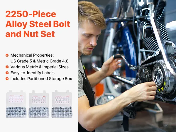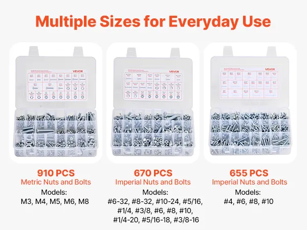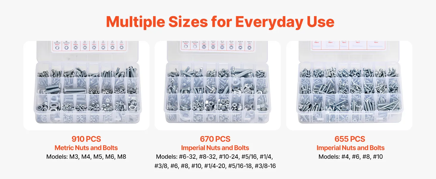 2250-Piece Multi-Specification Set: Includes 910 metric bolts (M3, M4, M5, M6, M8) and SAE bolts (#4, #6, #8, #10, #1/4, #3/8, #5/16, #6-32, #8-32, #10-24, #1/4-20, #5/16-18, #3/8-16). Perfect for repairs and replacements