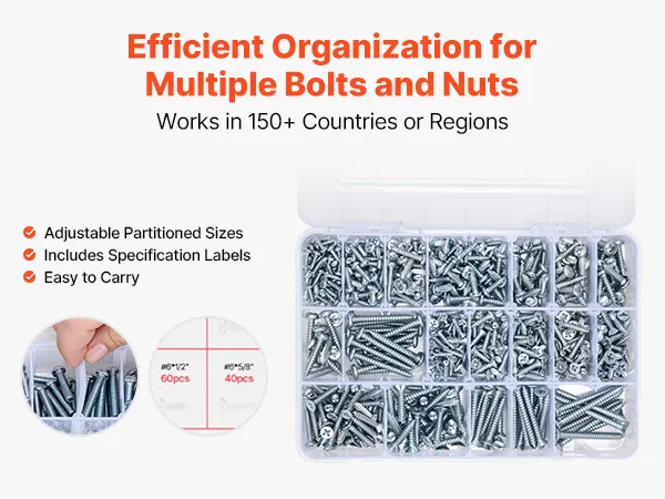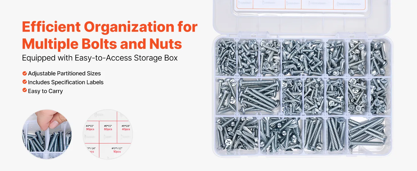 We provide a transparent storage box with dividers, and the lid features clear size labels for easy access to the right parts. The dividers are adjustable, allowing you to customize the storage space.