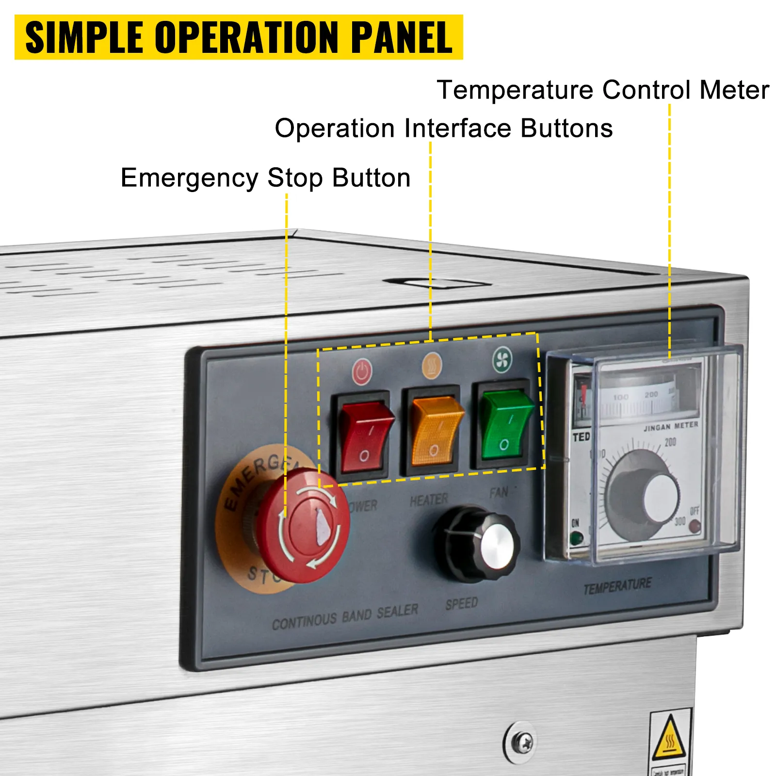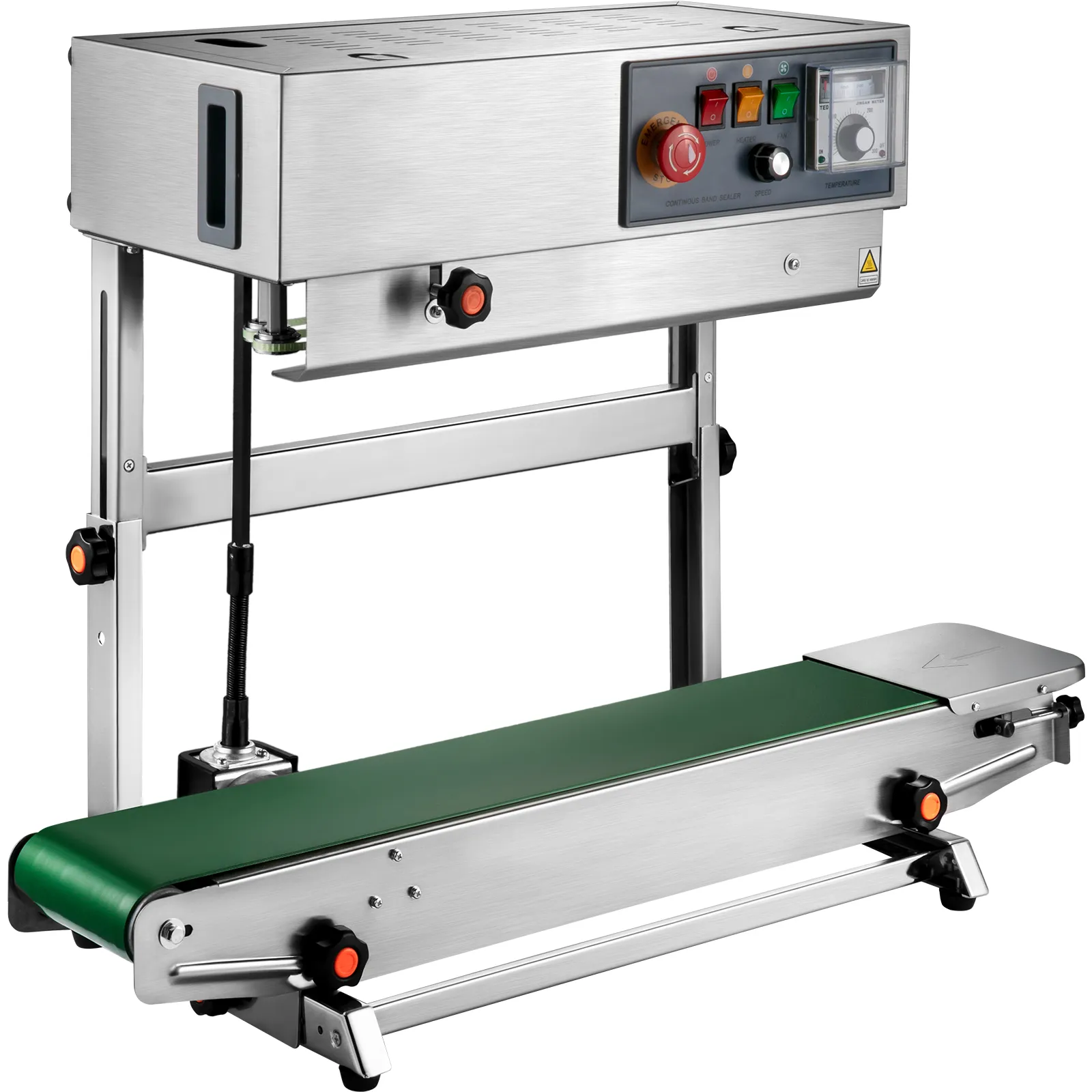 Easy to operate the continuous band sealer with an easy-to-understand control panel. You can control the fan, heat, and speed. A temperature adjusting device and an emergency stop button are practical.