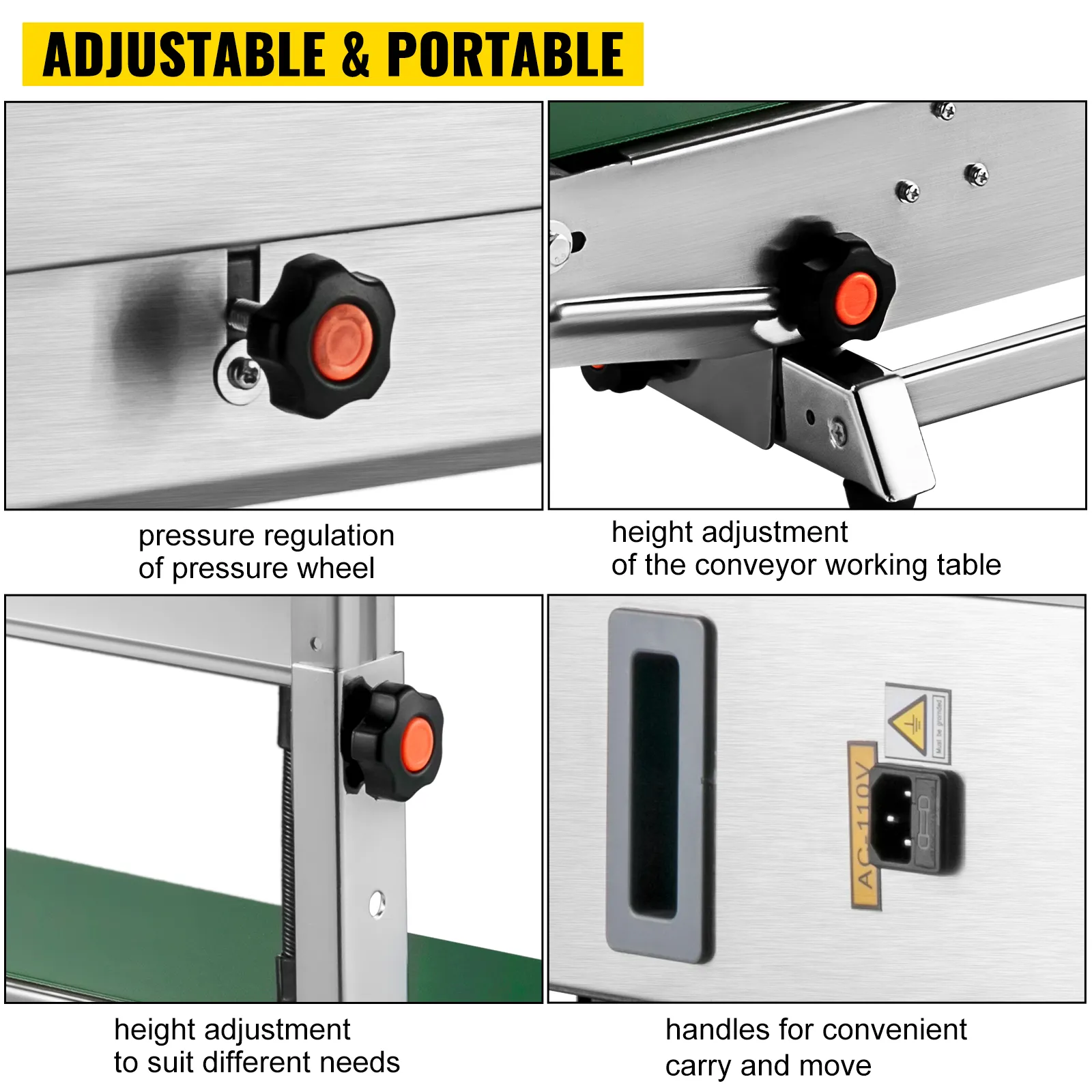 The up and down and front and behind of the conveying table are adjustable. The pressure control button can be adjusted to meet the different thicknesses of films. Two handles are for easy carry and exhaust holes are for heat dissipation.