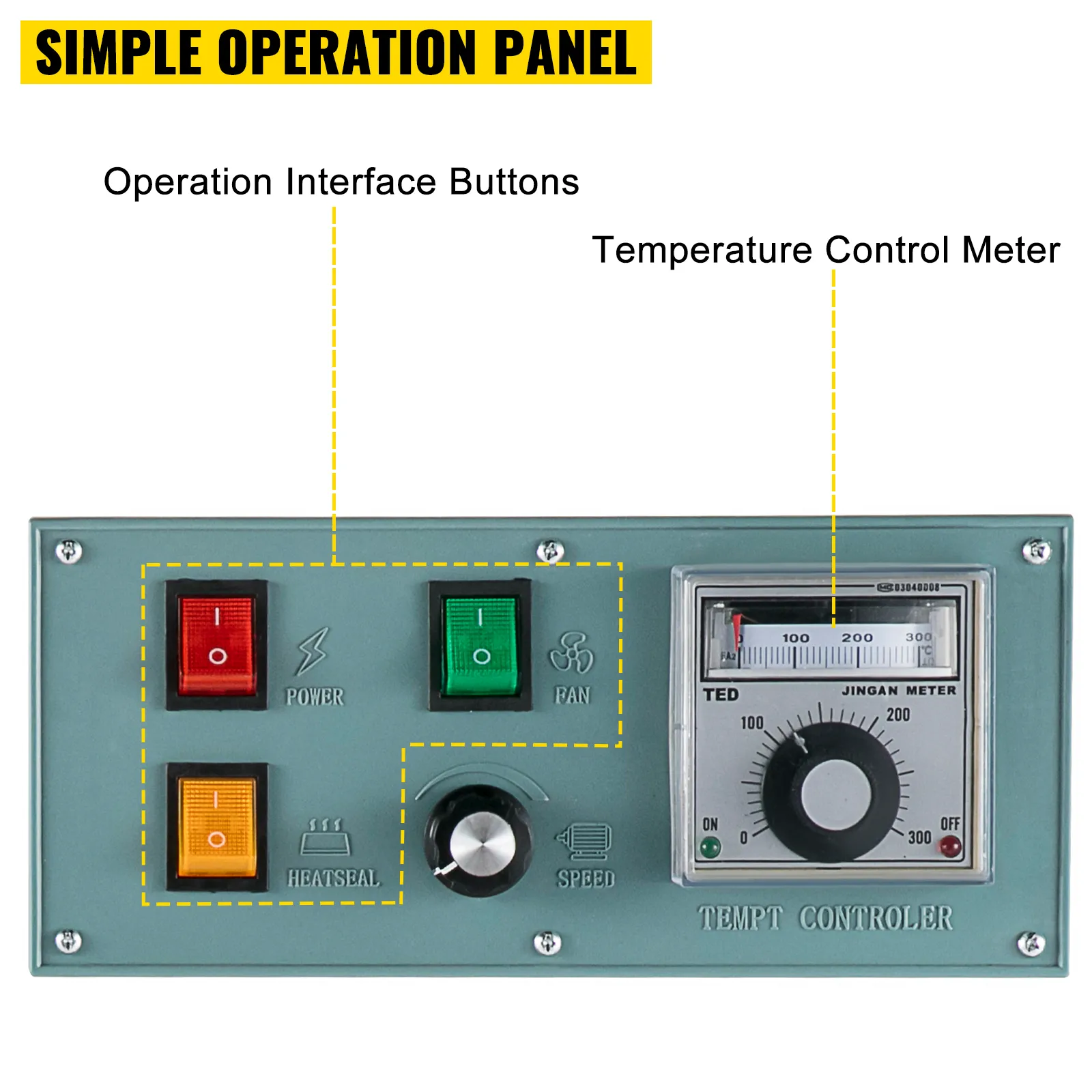 Easy to operate the continuous band sealer with an easy-to-understand control panel. You can control the fan, heat, and speed. There is a dial temperature control meter for monitoring and adjusting the temperature.