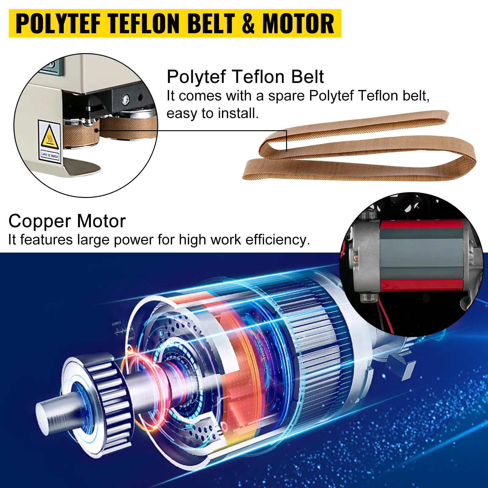 The continuous bag sealer machine is solid and robust. The enlarged pure copper motor features strong power, low noise, and stable performance. Besides, the plastic bag sealing machine comes with an extra Polytef Teflon belt, high temperature-resistant.
