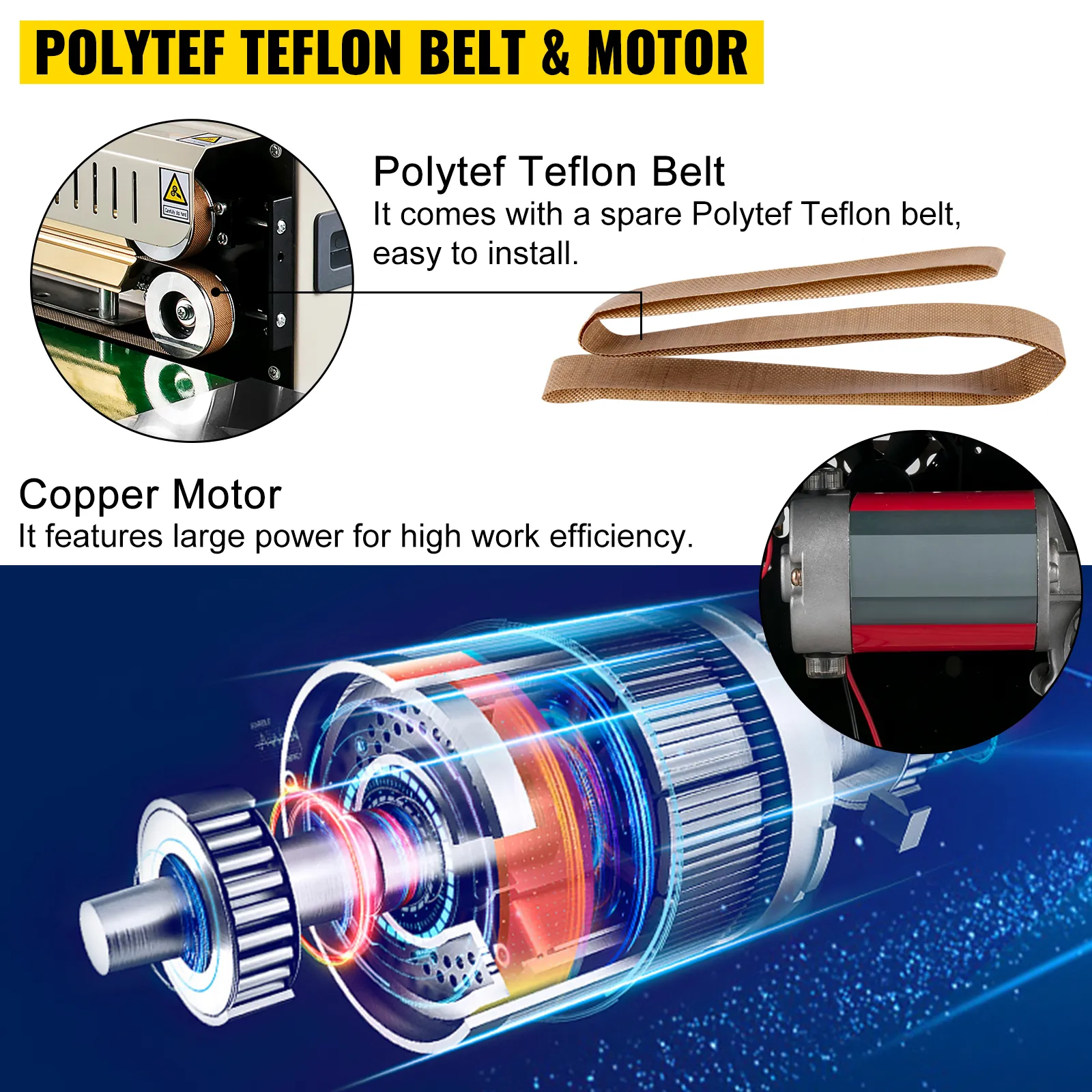 The continuous bag sealer machine is solid and robust. The enlarged pure copper motor features strong power, low noise, and stable performance. Besides, the plastic bag sealing machine comes with an extra Polytef Teflon belt, high temperature-resistant.