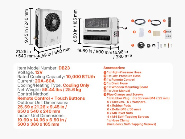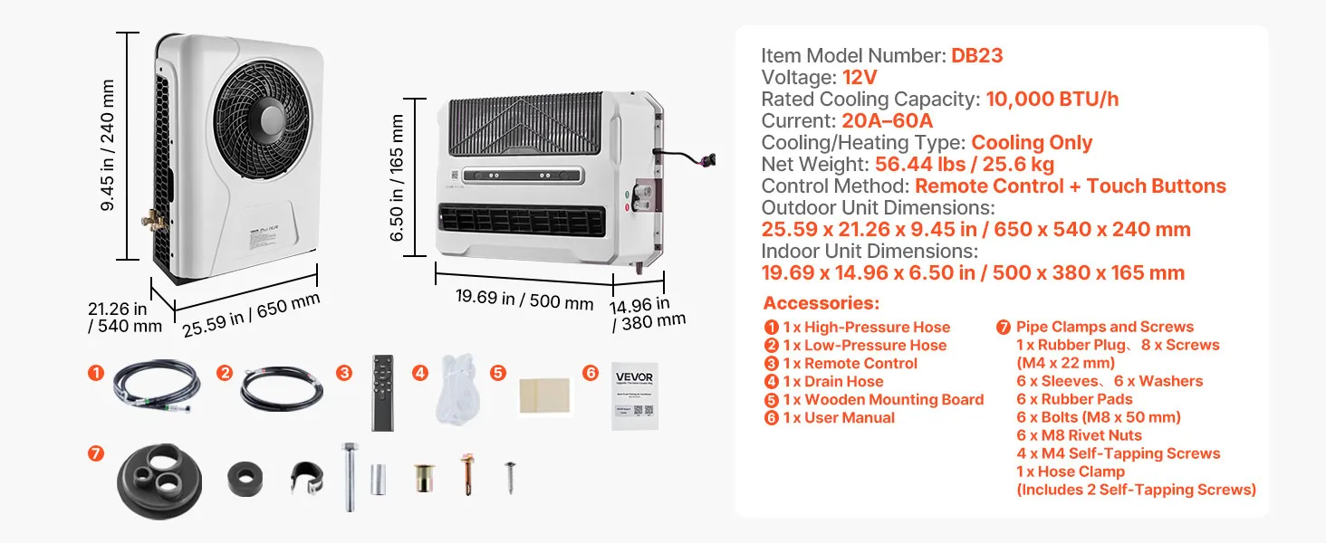 VEVOR Truck Air Conditioner, 12V 10000 BTU Mini Split AC Unit, 400 m³/h Airflow Cab Air Conditioner, Fast Cooling Low Noise for Semi Truck, Camper, Construction Vehicle, Crane, Tractor, Excavator