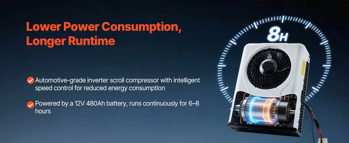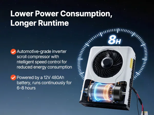 Energy Efficient: Our truck AC unit uses automotive-grade inverter technology for improved efficiency. The smart variable-frequency scroll compressor automatically adjusts speed to reduce power consumption. It can run for 6–8 hours on a 12V battery
