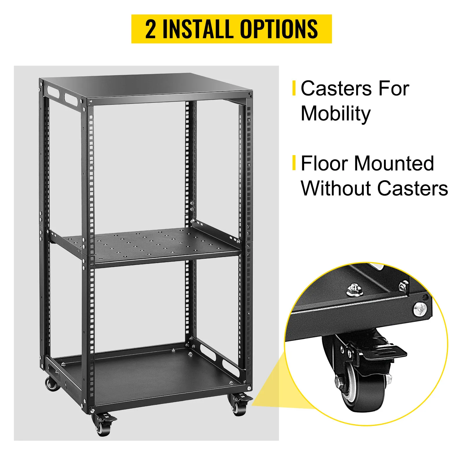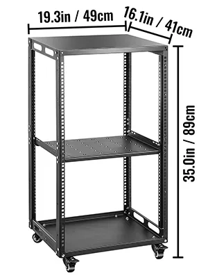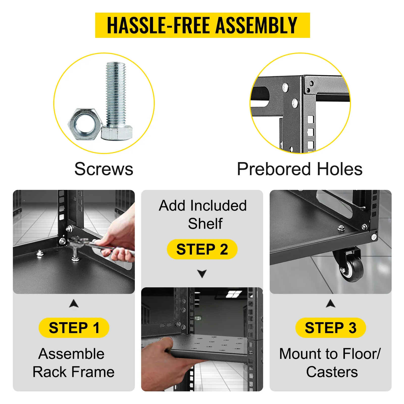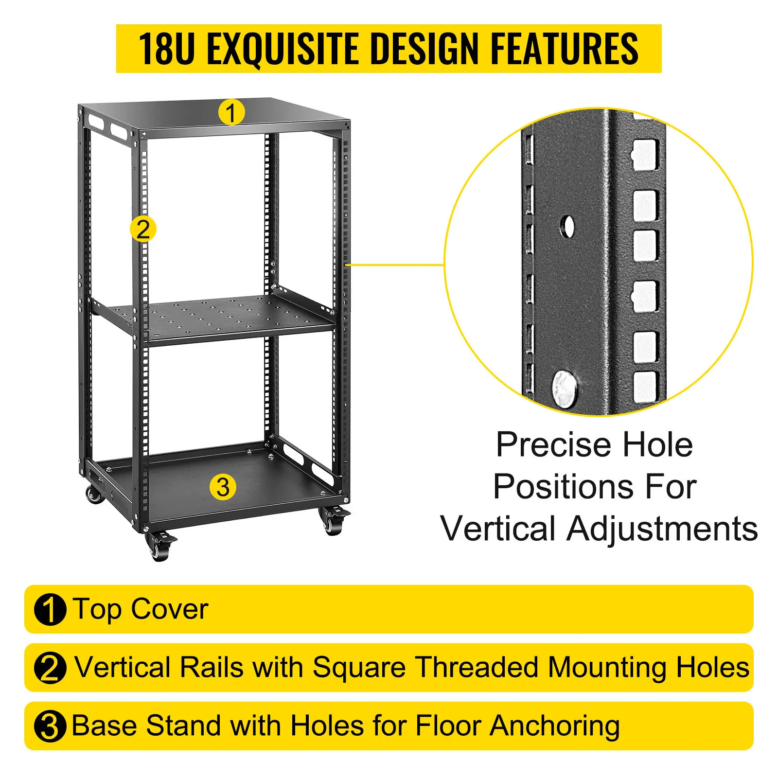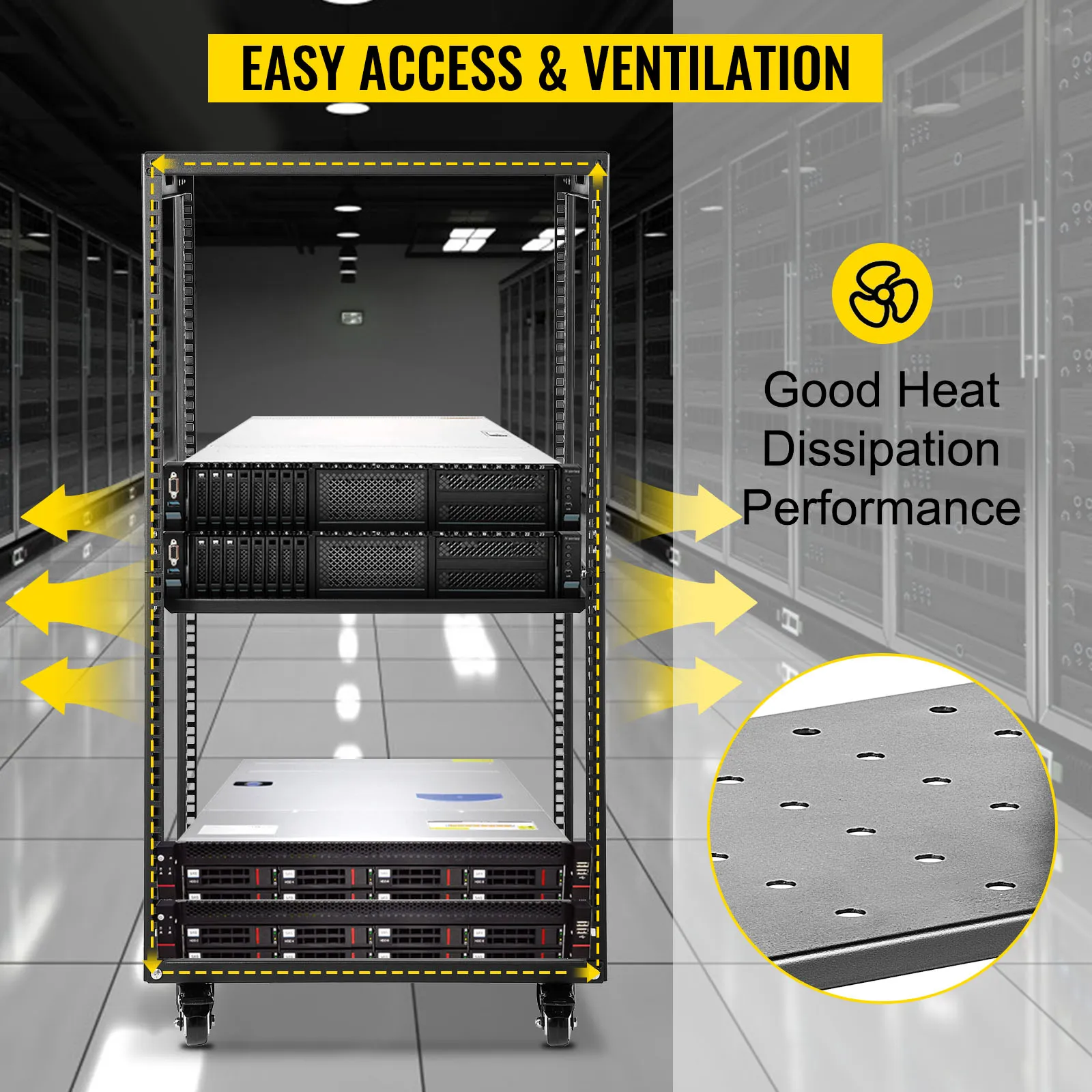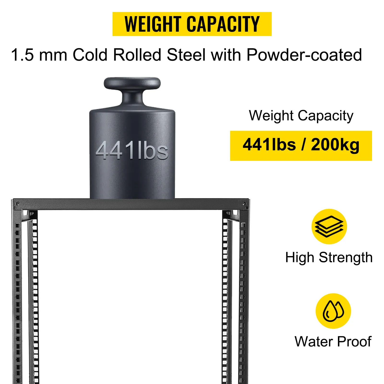 VEVOR’s 4-post open frame server rack is an ideal, economical solution for secure IT environments and other applications not requiring a lockable enclosure. Our product provides 18U of rack space and can support a total weight capacity of up to 441 lbs / 200 kg. The rack features heavy-duty cold-rolled steel construction, easy assembly, and a self-squaring design with provision for bolt-down. It offers a reliable solution for mounting servers, UPS, and other rack-mountable equipment.