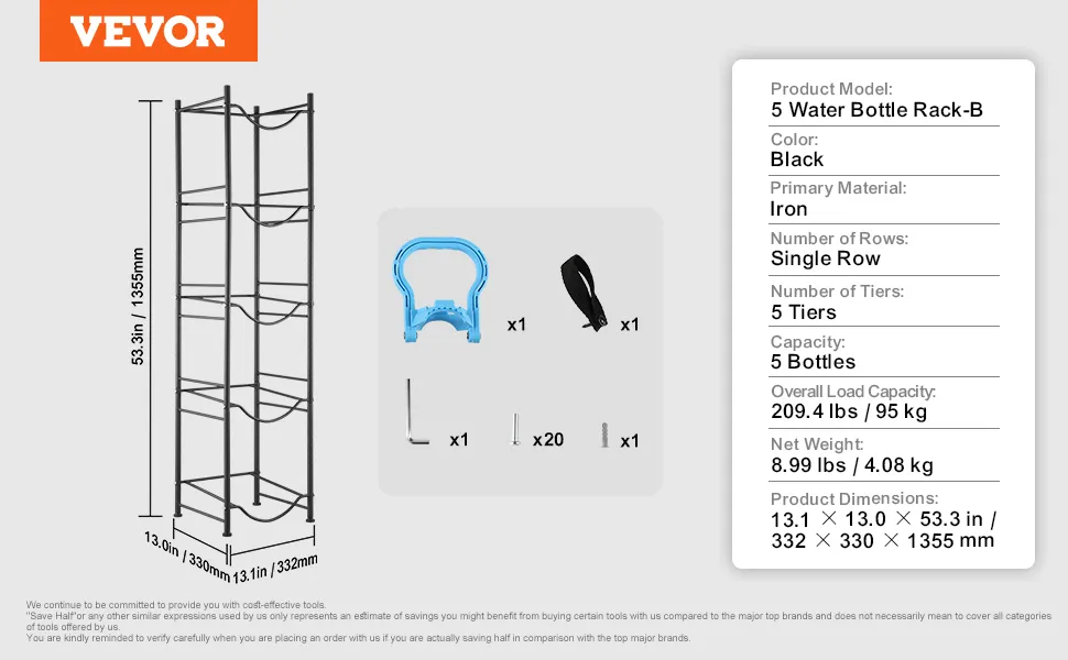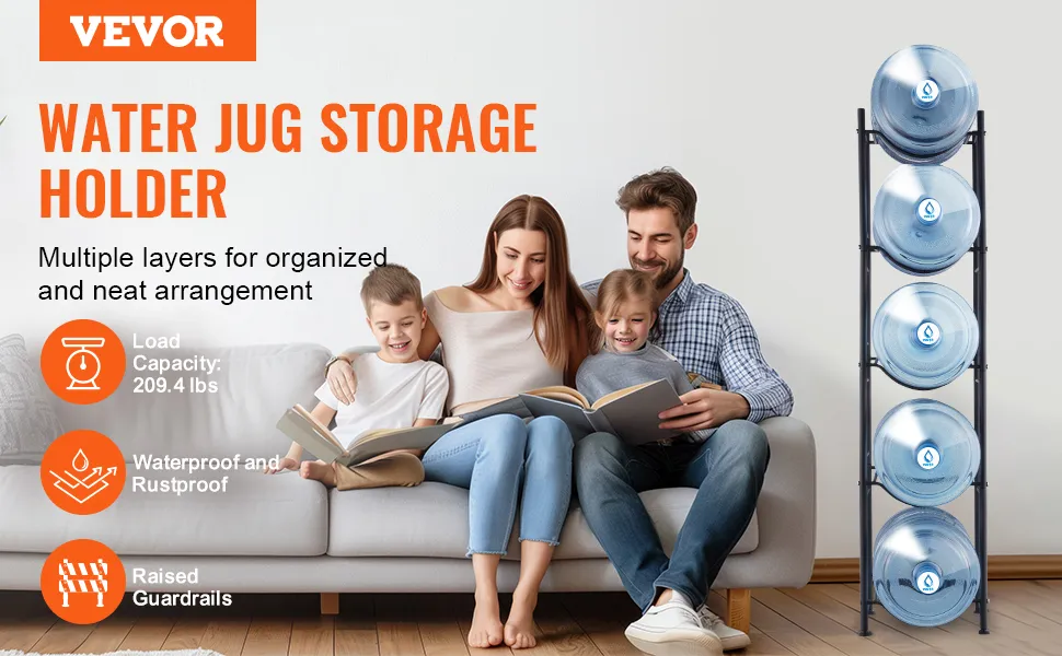 This 5-tier water jug holder measures 13 x 13 x 53.3 in, holds up to 5 bottles and supports up to 209.4 lbs. Its minimalist industrial design fits various interiors, making it an ideal choice for any space.
