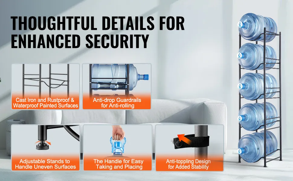 The water jug rack is made from durable cast iron with a rust-resistant finish. High guardrails and shelf grooves prevent bottles from sliding. Adjustable feet and an anti-tip feature keep the rack stable on uneven floors. Handles make lifting and placing bottles easy.