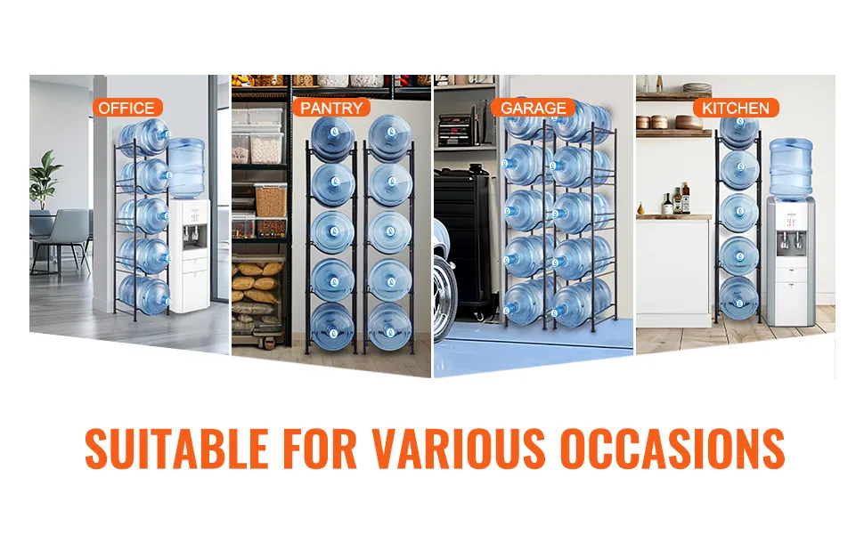 The water jug stand is perfect for living rooms, storage rooms, kitchens, garages, food pantries, closets, laundry rooms, gyms, and offices. It provides an efficient solution for storing multiple bottles.