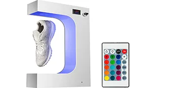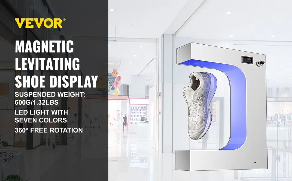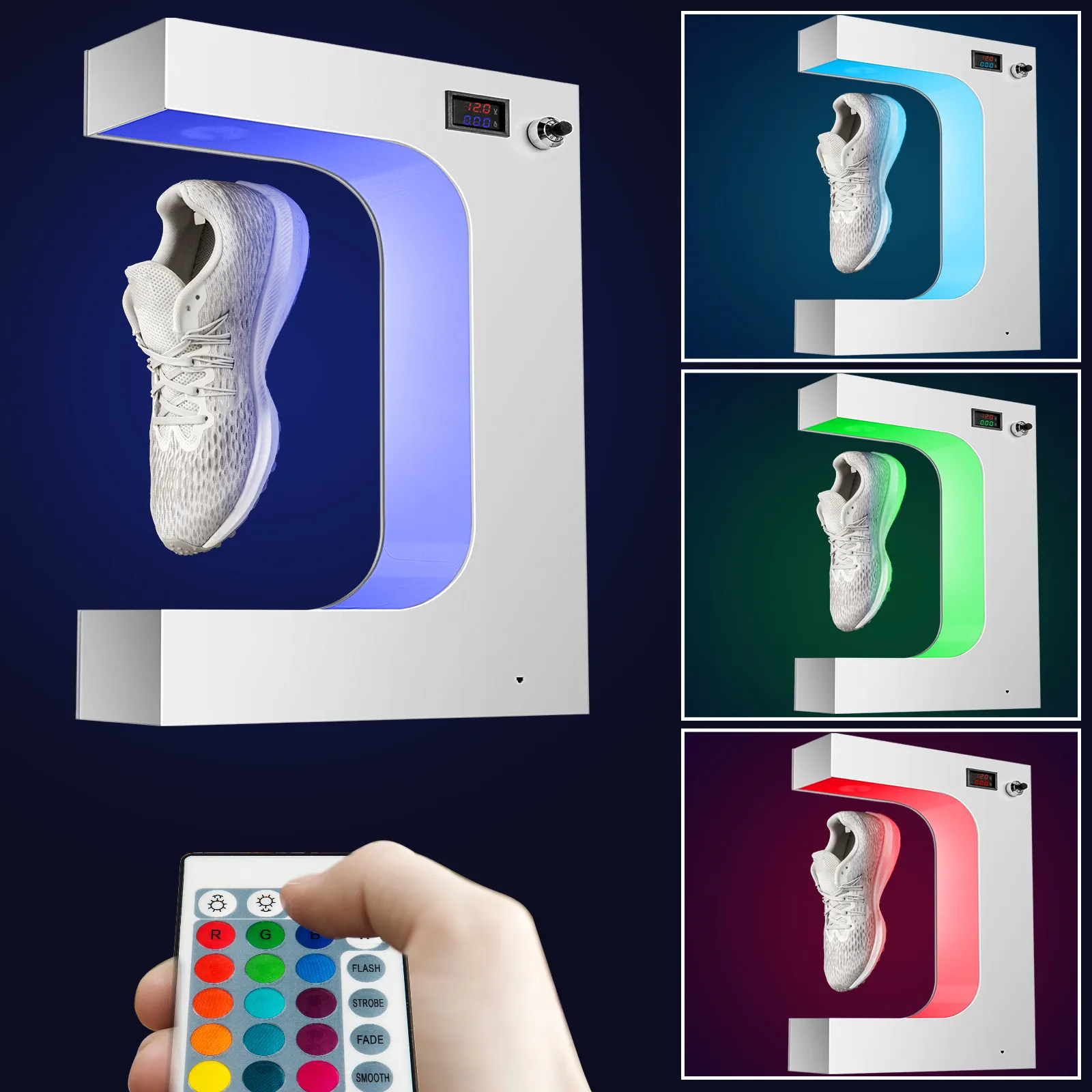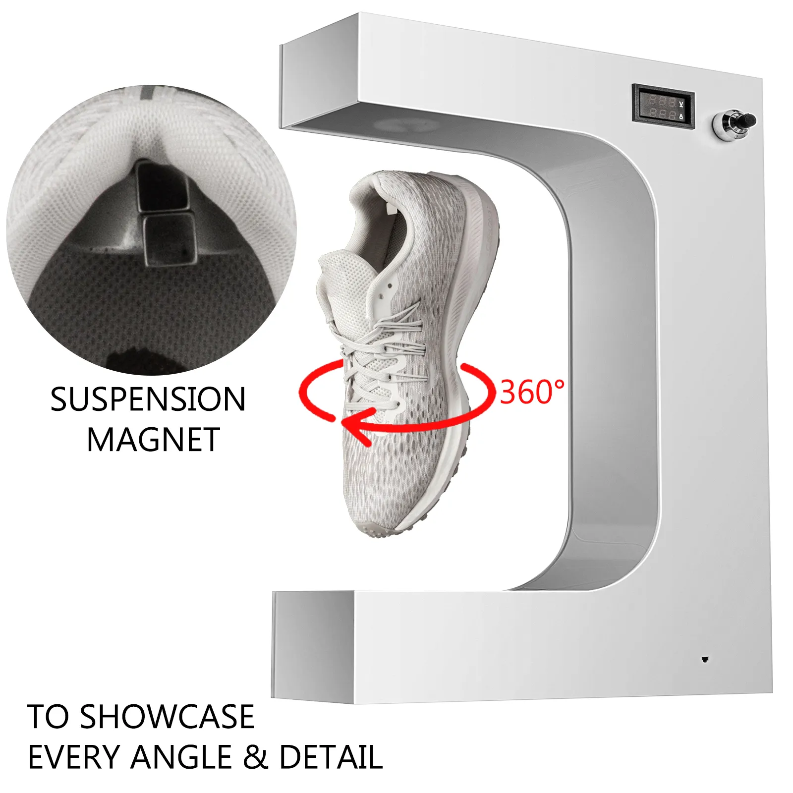 This shoe stand display is made from sturdy acrylic material with brilliant LED light, designed to display shoes or other objects. With the permanent levitation and 360-degree auto-rotation functions, the sneaker stand can showcase every inch of your prized possession and keep it in constant view. Our shoe display is equipped with an adjustable potentiometer, allowing variable suspended weights, up to 600 g/1.32 lbs.