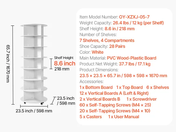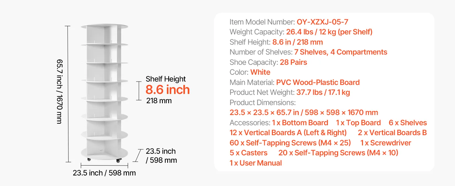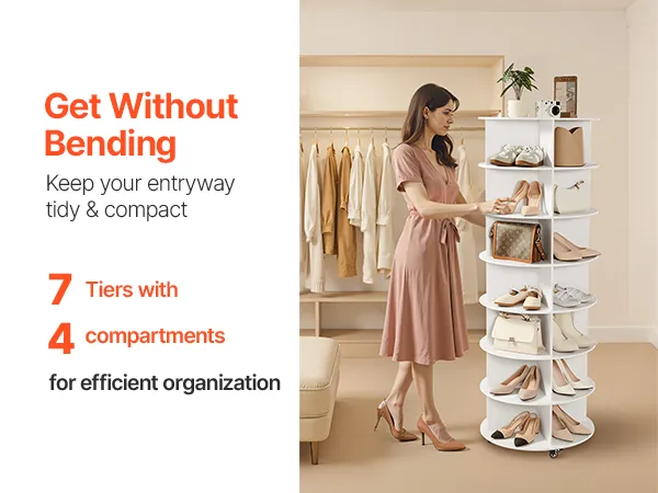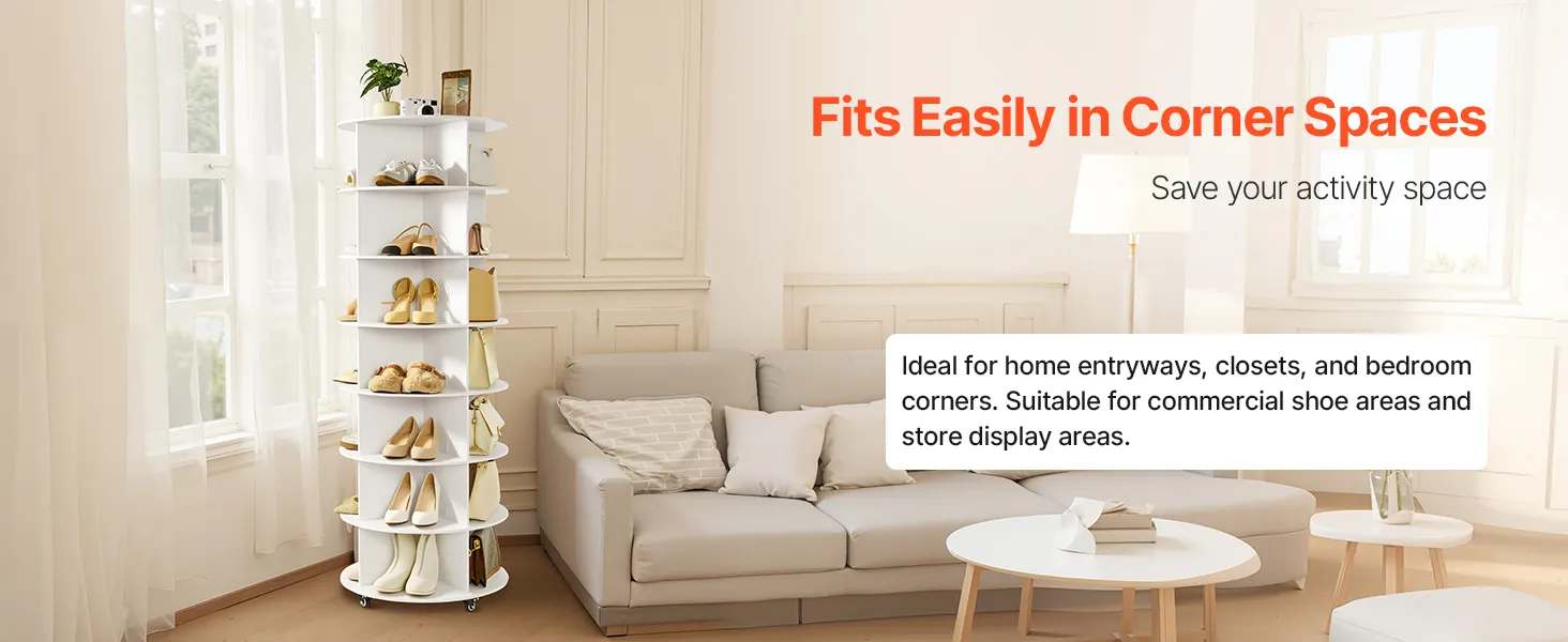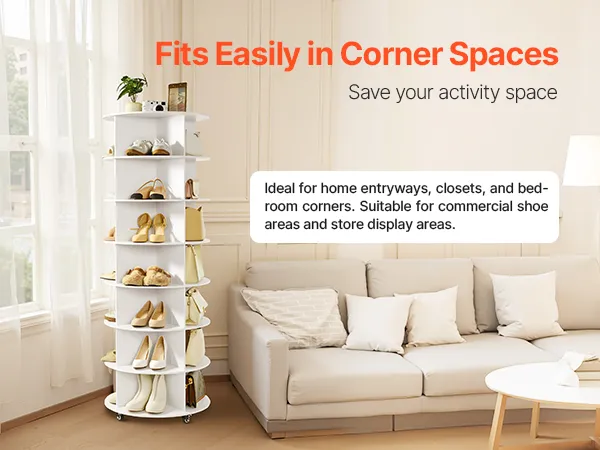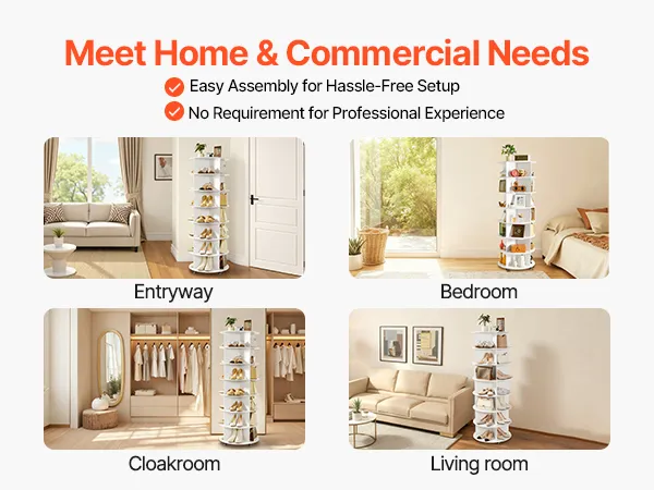 With a minimalist look and 2 classic color options, the spinning shoe rack tower fits into home foyers, wardrobes, bedroom corners, as well as store shoe areas and mall display zones—combining storage and decor. Including an illustrated manual and complete accessories, it is easy to install.