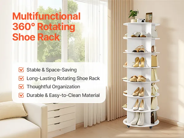 VEVOR 7 Tiers Rotating Shoe Rack Tower with Wheels, Movable 360° Spinning Carousel Display, Lazy Susan Organizer Closet Shelf for Living Room, Entryway, White