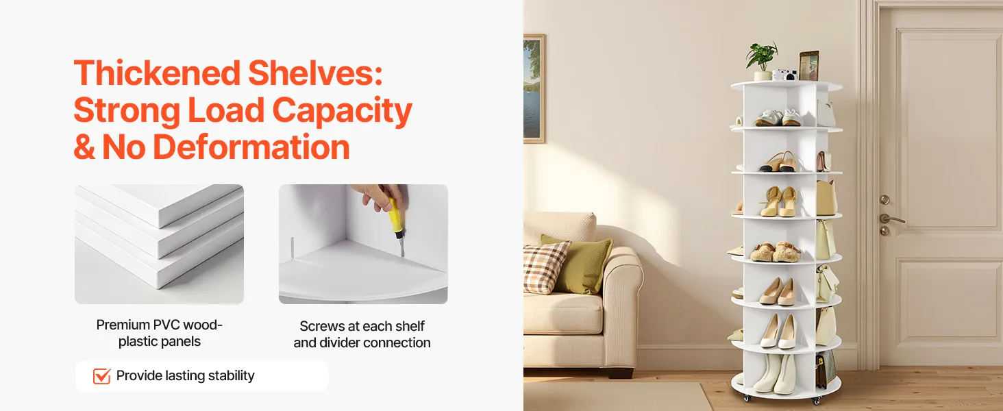Sturdy & Long-Lasting: The rotating shoe organizer made of PVC wood-plastic panels, each tier can bear up to 35 lbs, so you can store heavier items without worry. Its screw-fastened panels avoid slipping and wobbling. Easy to clean and maintain.