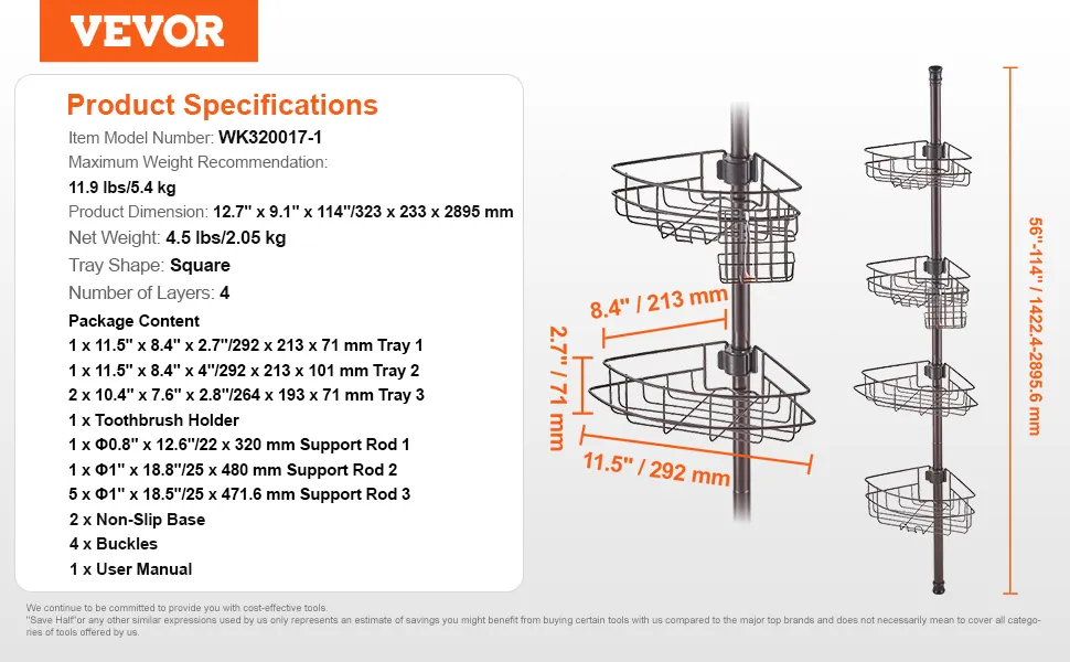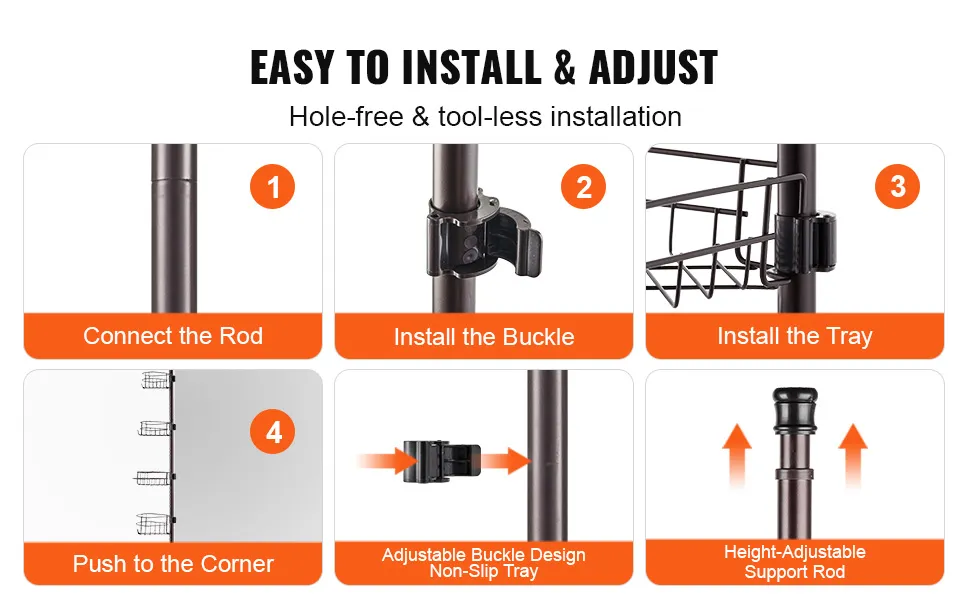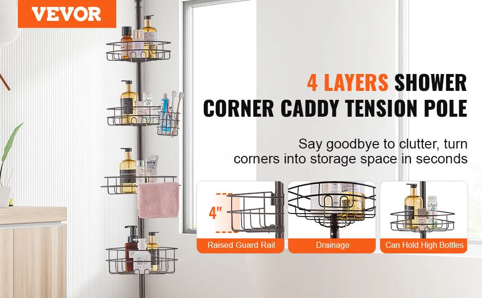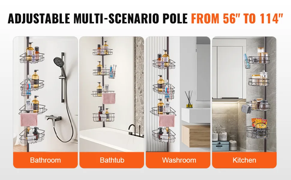 The 56" to 114" adjustable tension pole can adjust according to the actual height of your bathroom, whether it's a high-rise apartment or a low-rise home. Meanwhile, the separate shower organizer can be placed not only in the bathroom, but also in the bathtub, RV etc.