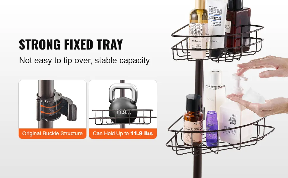 Innovative Buckle Design: The shower corner caddy tension pole is equipped with innovative buckle locking device, which simplifies and stabilizes the installation process, effectively avoiding the tray from slipping. Its strong load-bearing tray can easily support up to 11.9lbs of heavy loads, providing a secure place for you to use.