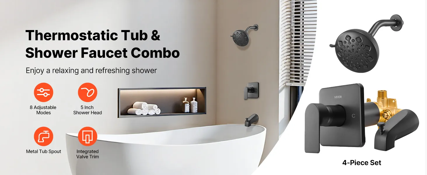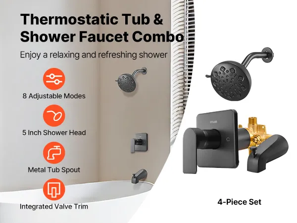 This 4-piece tub and shower faucet set features a 5 in shower head with 8 adjustable spray modes and a bathtub spout, providing you with multiple showering options for a relaxing and refreshing shower.