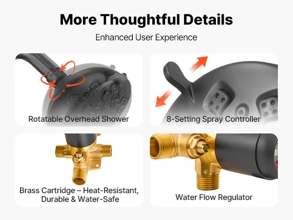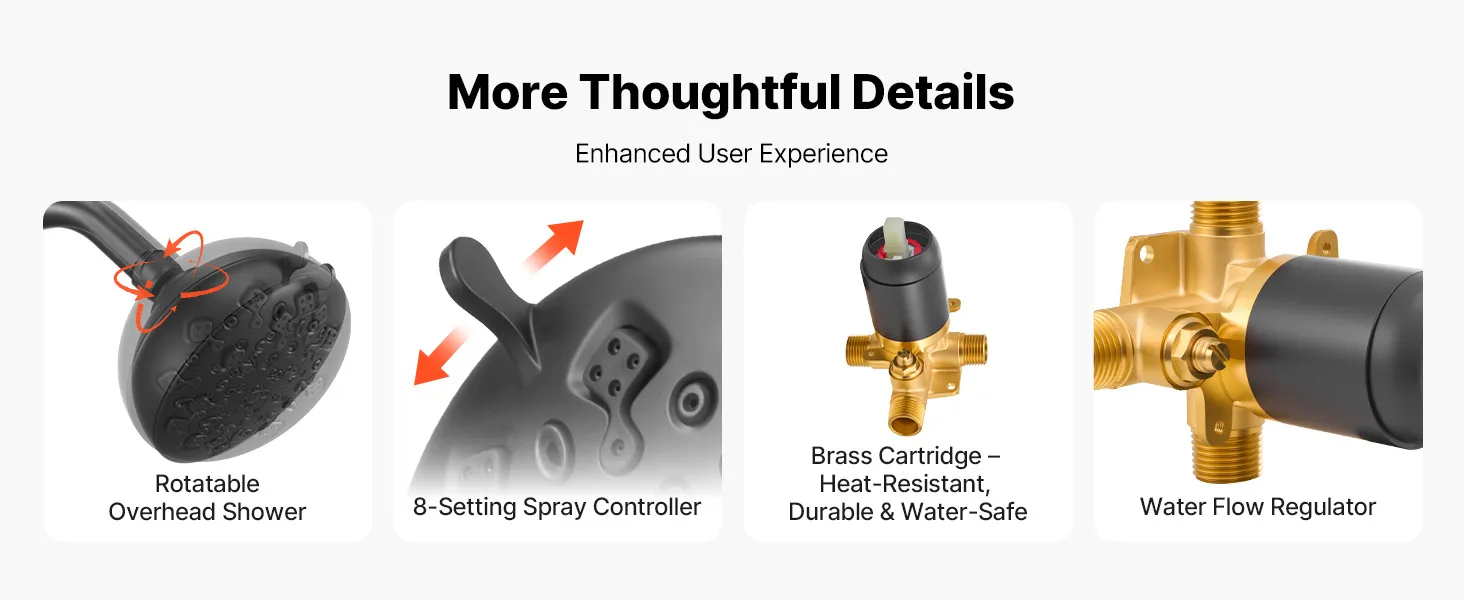 Our shower tub faucet set includes a rotatable overhead spray, an 8-setting spray controller, a sturdy brass cartridge, and a water flow regulator. Thoughtful details improve your daily shower experience.