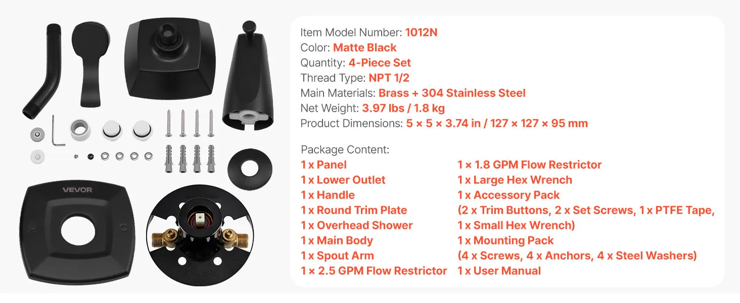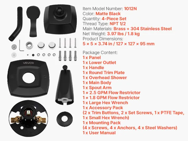 4-Piece Set: This tub and shower faucet set includes both bathtub and shower faucets, compatible with most standard installations. It can be connected to standard NPT 1/2 in American pipes. Suitable for bathrooms with both shower and bath modes