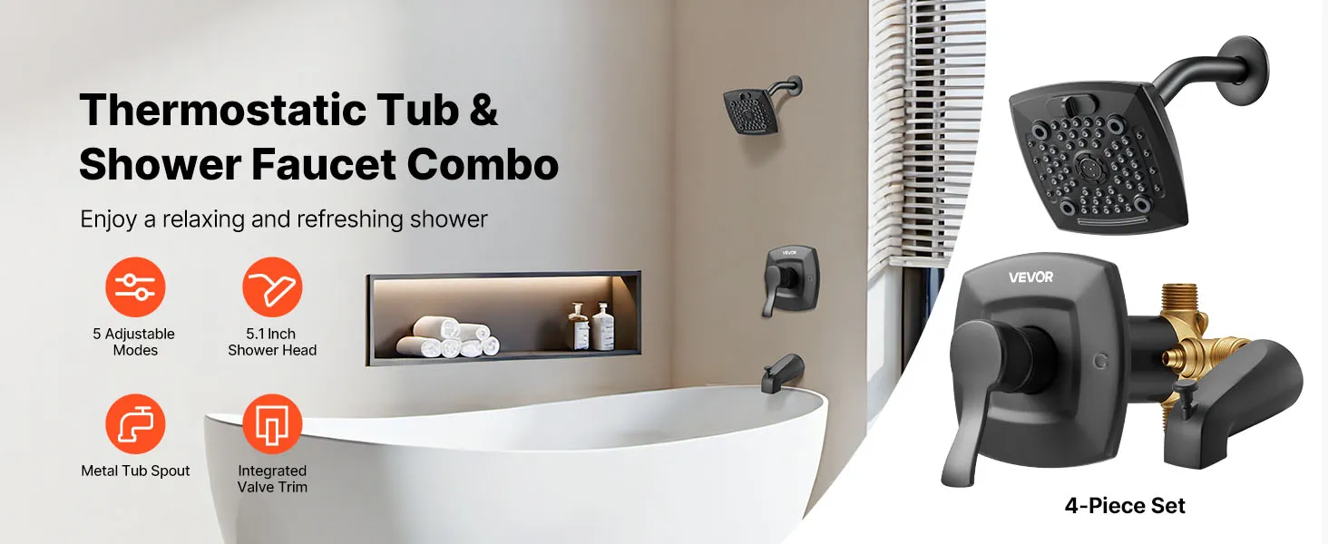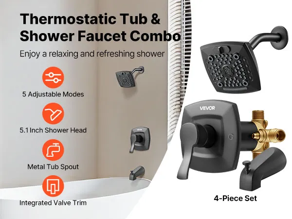 This 4-piece tub and shower faucet set features a 5.1 in shower head with 5 adjustable modes and a bathtub spout, providing you with multiple showering options for a relaxing and refreshing shower.