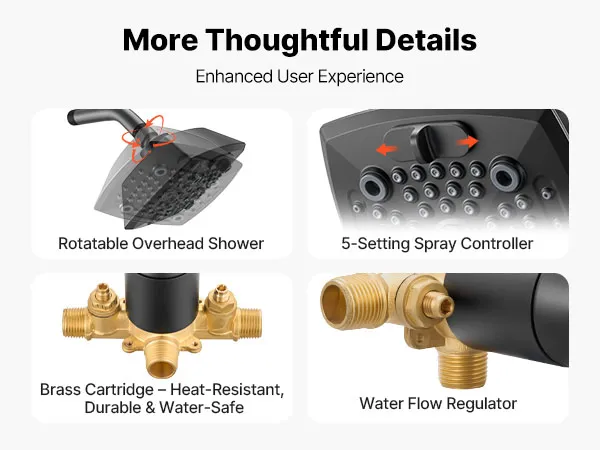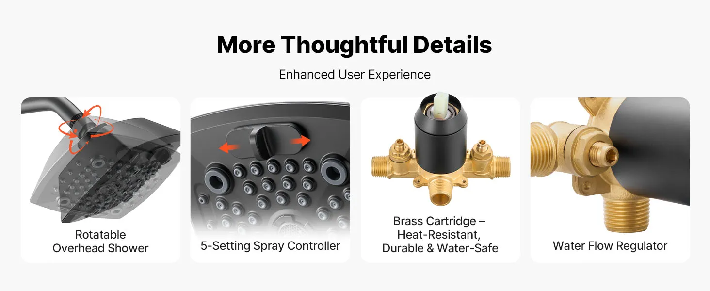 Our shower tub faucet set includes a rotatable overhead spray, a 5-setting spray controller, a sturdy brass cartridge, and a water flow regulator. Thoughtful details improve your daily shower experience.