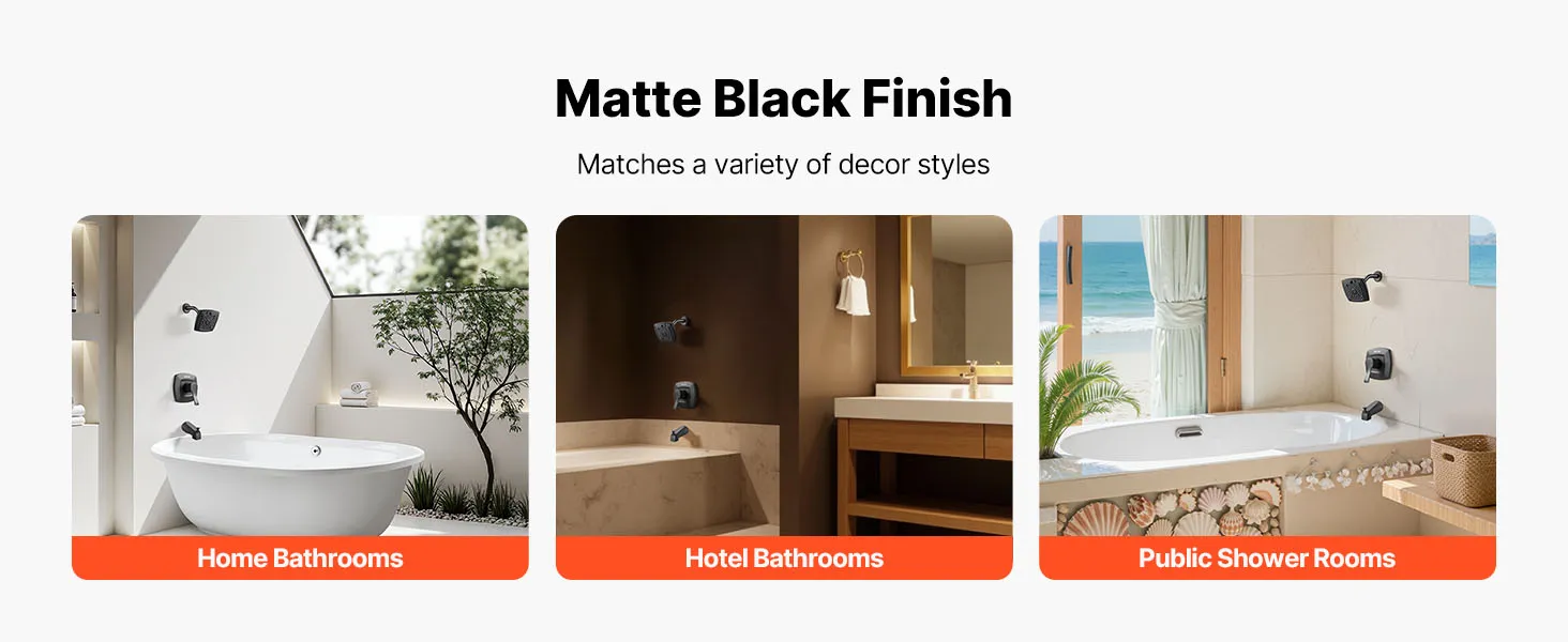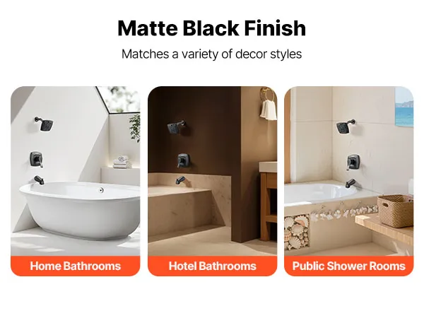 With a matte black finish, this shower and tub faucet set delivers a simple yet premium look, suitable for home bathrooms, hotel bathrooms, and public shower rooms.