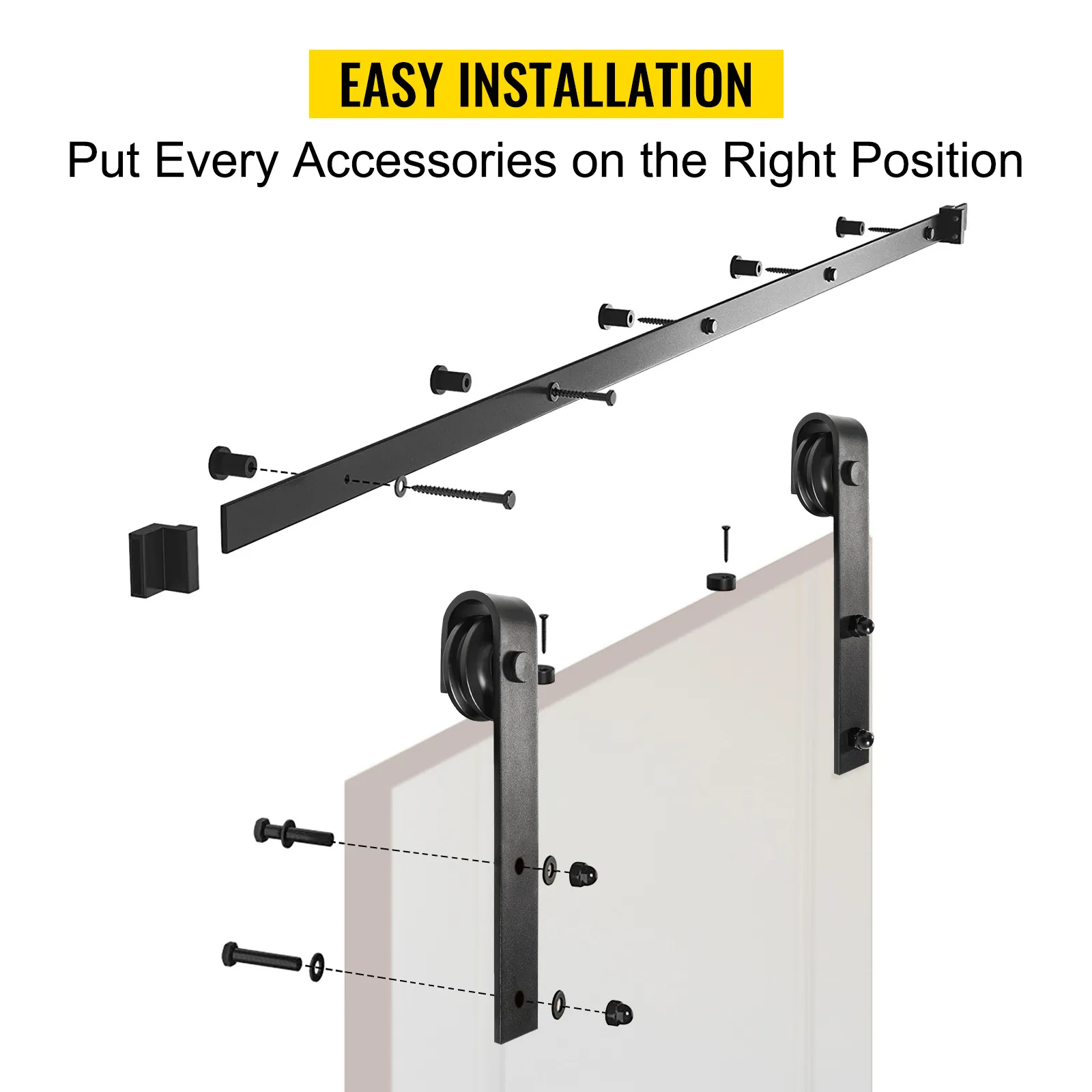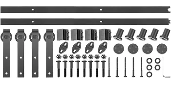 Barn door track includes 4 x hangers, 2 x tracks, 5 x track supports, 5 x M8*90 screws, 8 x M10* 60 screws, 4 x door stoppers, 4 x anti jumper, 4 x floor guides. As the picture shows, you can install every accessory in the right position.