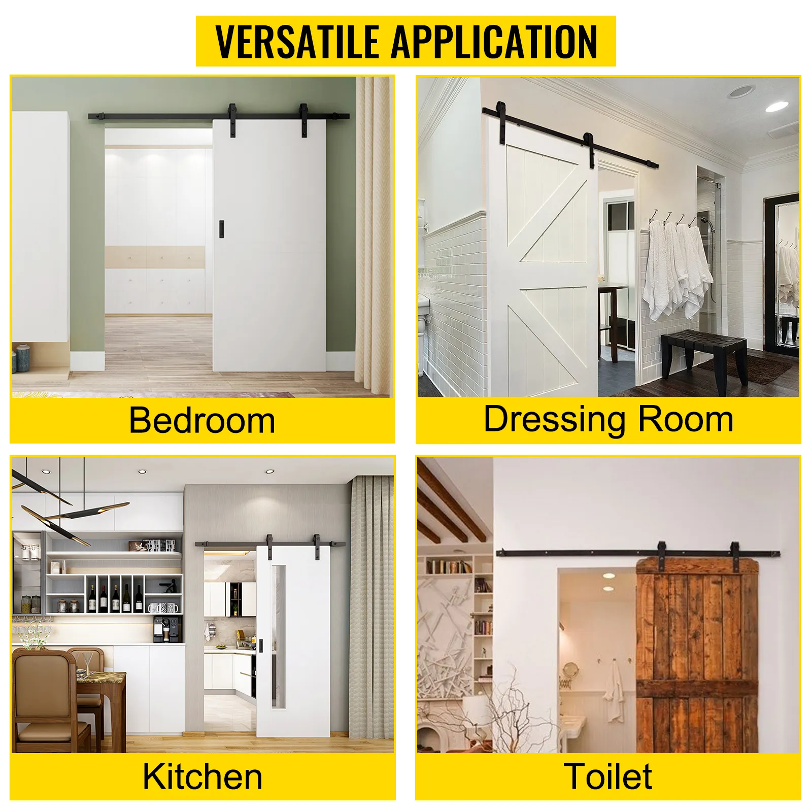 The sliding barn door kit can be installed on both wooden walls and concrete walls. A bedroom, dressing room, kitchen, barns, garages, and stables are great for usage.
