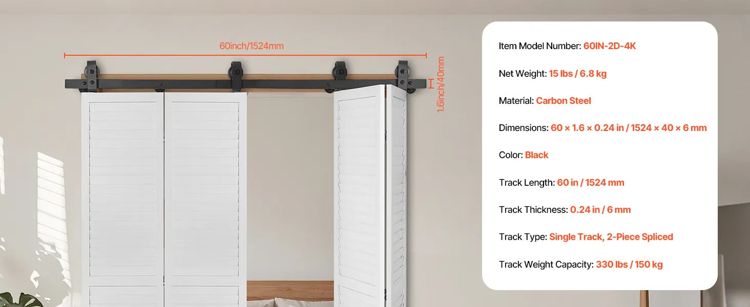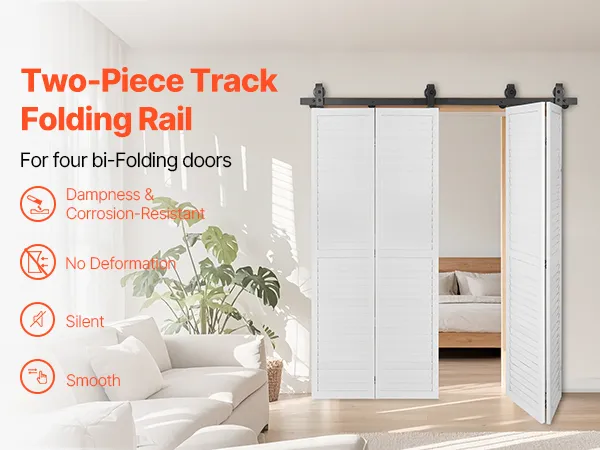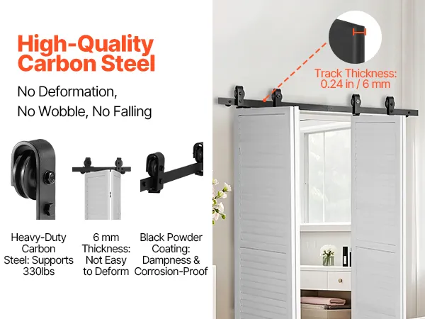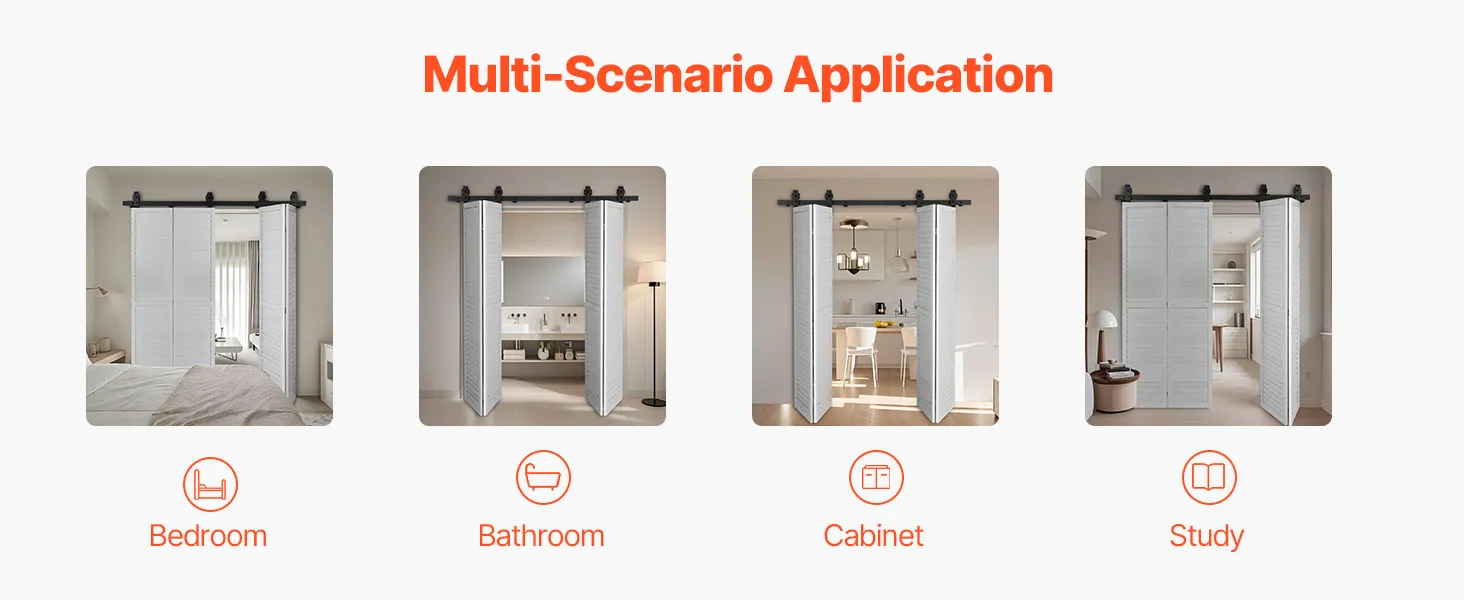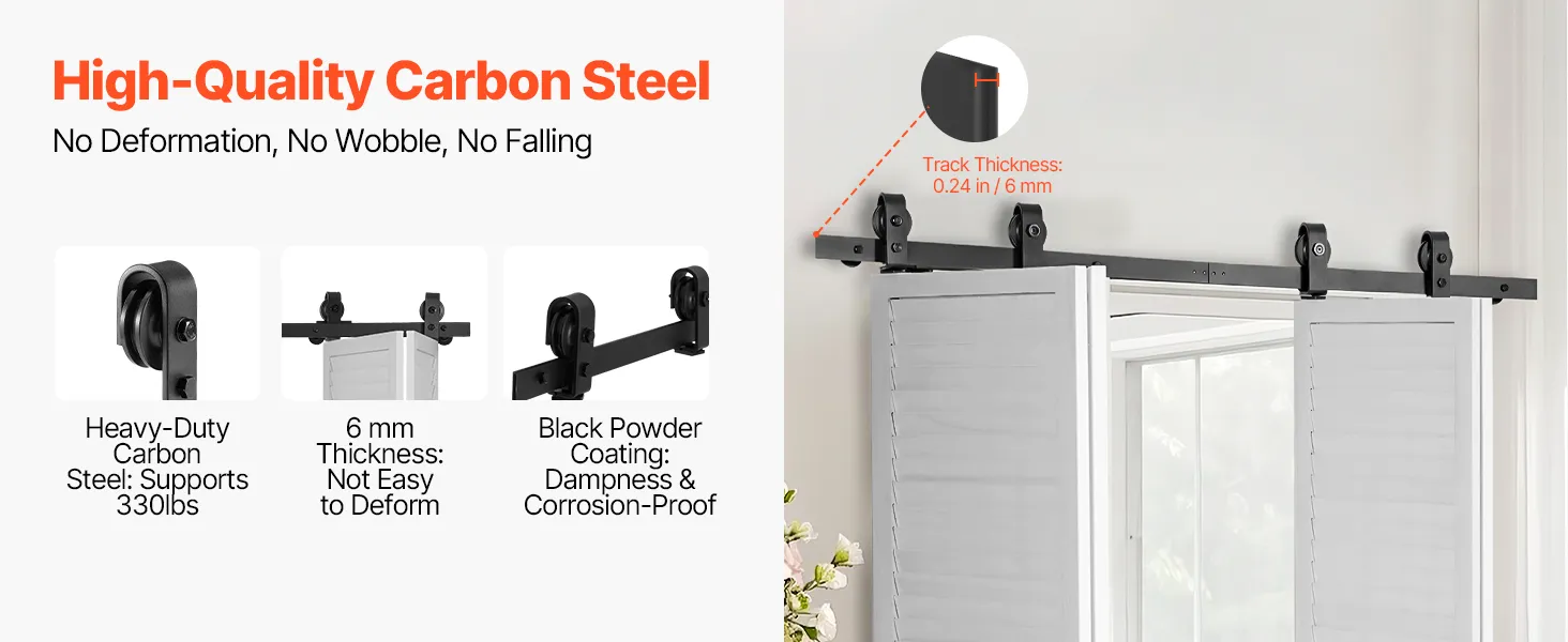 Our folding barn door hardware kit is made from durable carbon steel, supporting up to 330 lbs(150 kg). These bifold closet door tracks feature a folding design that maximizes space, and the black powder coating ensures corrosion resistance in humid areas like kitchens and bathrooms.