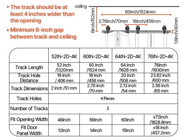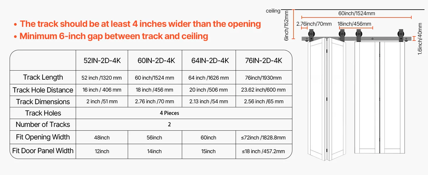 4-Door Compatibility: The single-track folding barn door hardware kit is designed for four-door setups. Ensure the track is at least 4 inches wider than the door opening, and there should be at least 6 inches of clearance between the track center and the ceiling for proper installation.