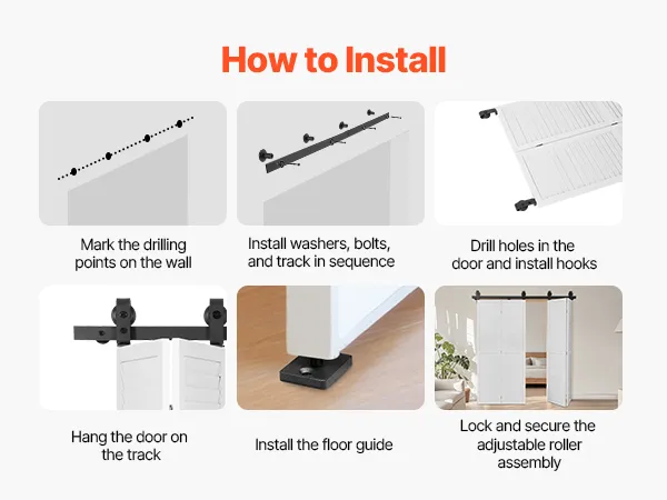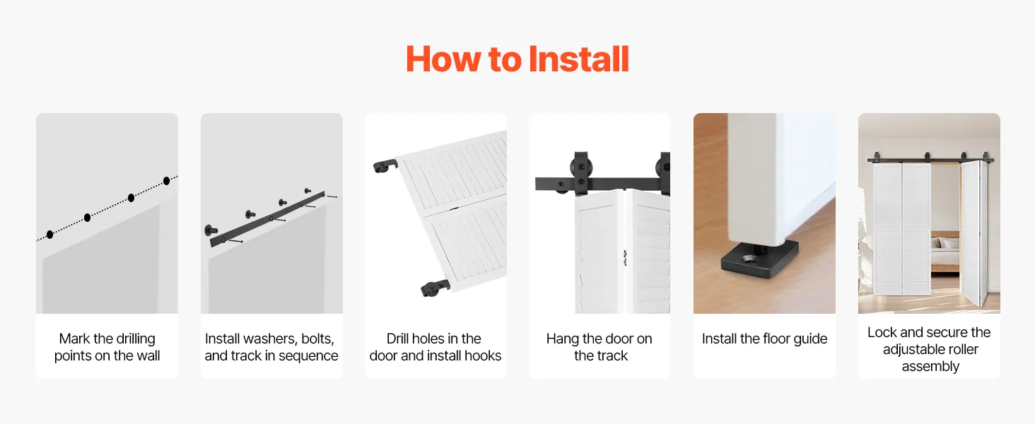 Easy Installation: Designed for easy setup, this barn door hardware kit for bifold doors comes with clear step-by-step instructions, allowing even beginners to quickly install and enjoy the benefits of it.