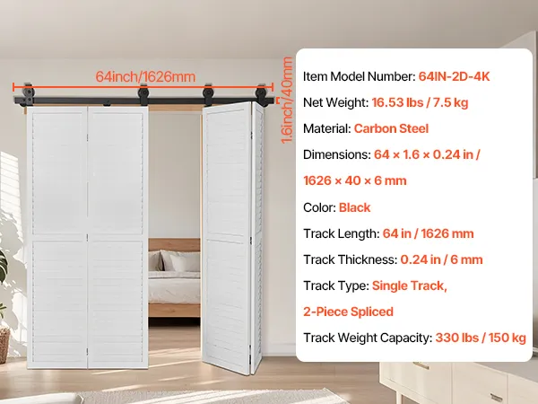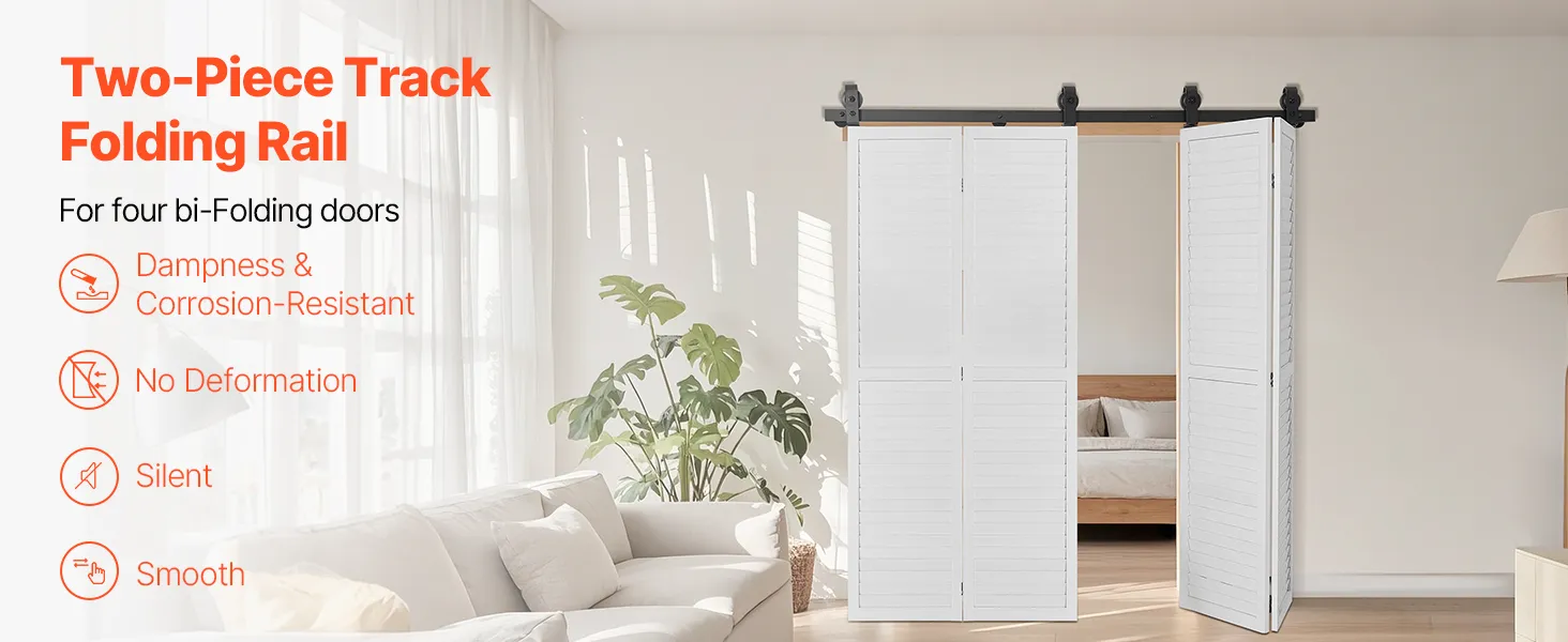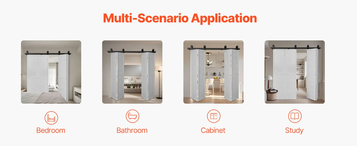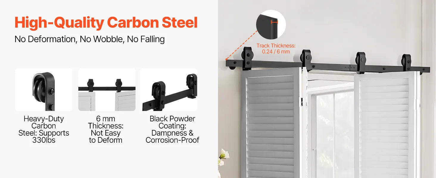Our folding barn door hardware kit is made from durable carbon steel, supporting up to 330 lbs(150 kg). These bifold closet door tracks feature a folding design that maximizes space, and the black powder coating ensures corrosion resistance in humid areas like kitchens and bathrooms.