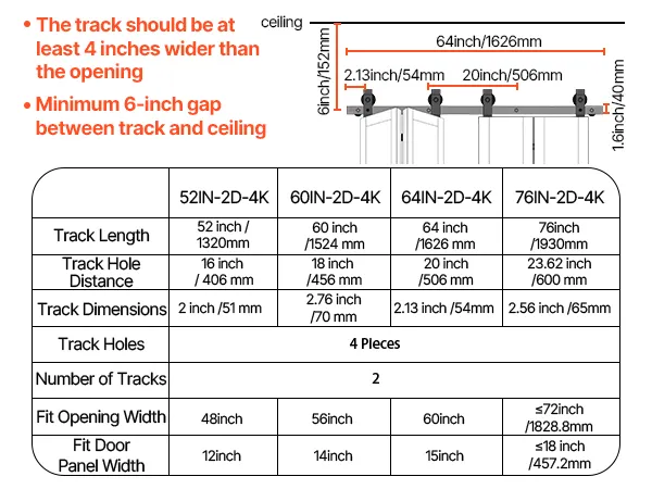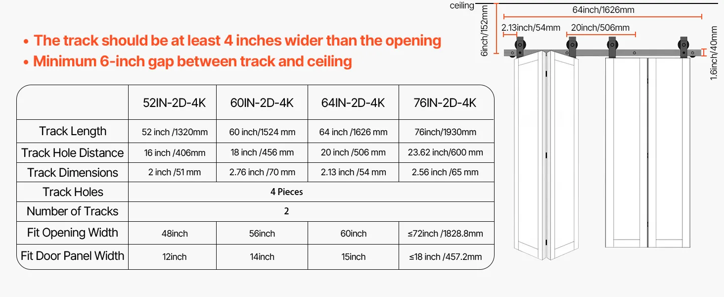 4-Door Compatibility: The single-track folding barn door hardware kit is designed for four-door setups. Ensure the track is at least 4 inches wider than the door opening, and there should be at least 6 inches of clearance between the track center and the ceiling for proper installation.