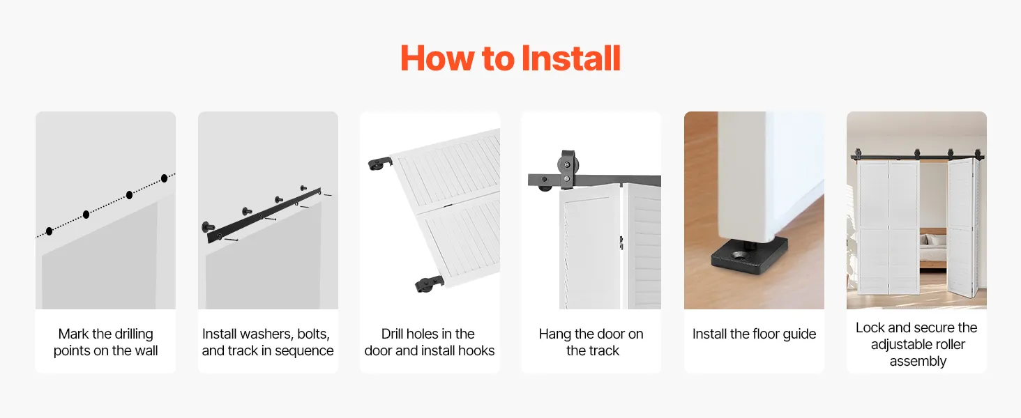 Easy Installation: Designed for easy setup, this barn door hardware kit for bifold doors comes with clear step-by-step instructions, allowing even beginners to quickly install and enjoy the benefits of it.