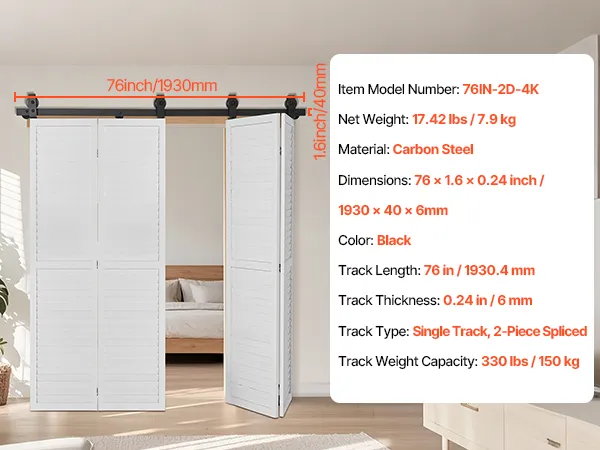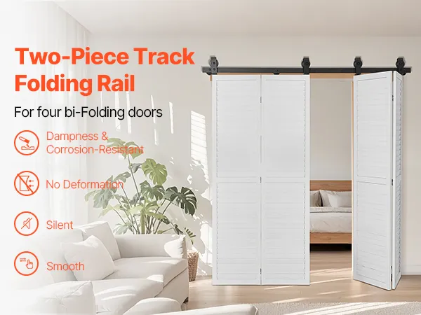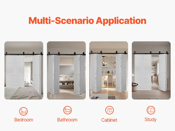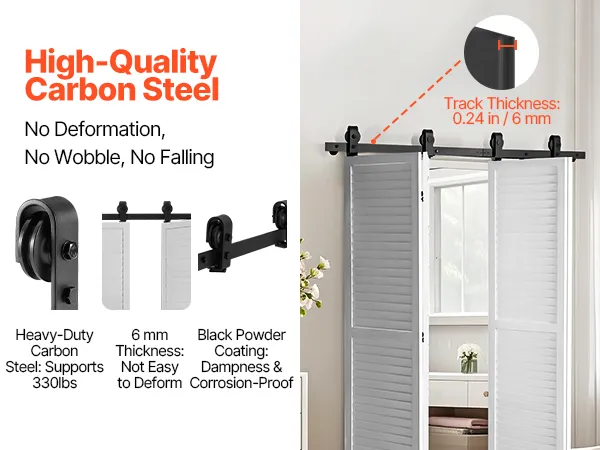 Our folding barn door hardware kit is made from durable carbon steel, supporting up to 330 lbs(150 kg). These bifold closet door tracks feature a folding design that maximizes space, and the black powder coating ensures corrosion resistance in humid areas like kitchens and bathrooms.