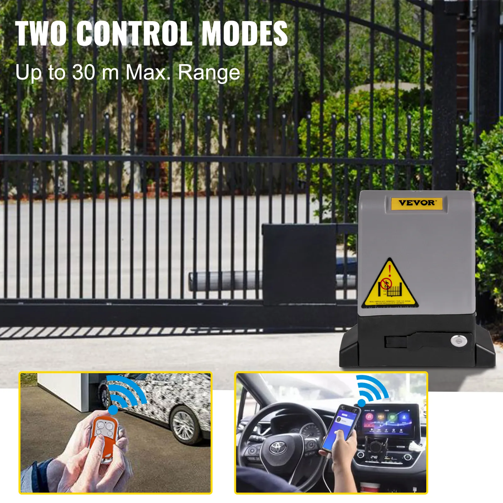 The automatic sliding gate opener adopts two remote control modes for your convenient access. One is the four remote controls up to a range of 98 ft/30 m. The other is to control the gate with the phone APP.