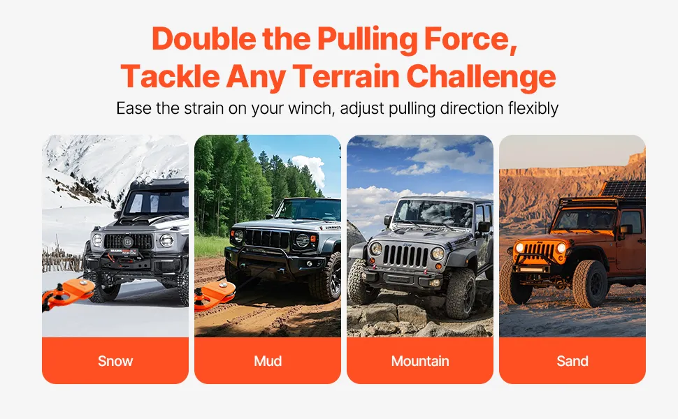 With the snatch block pulley, boost your winch’s pulling capacity! It reduces winch strain and prolongs its lifespan. Whether you're navigating mud, sand, or snow, this block helps your vehicle power through different terrains effortlessly.