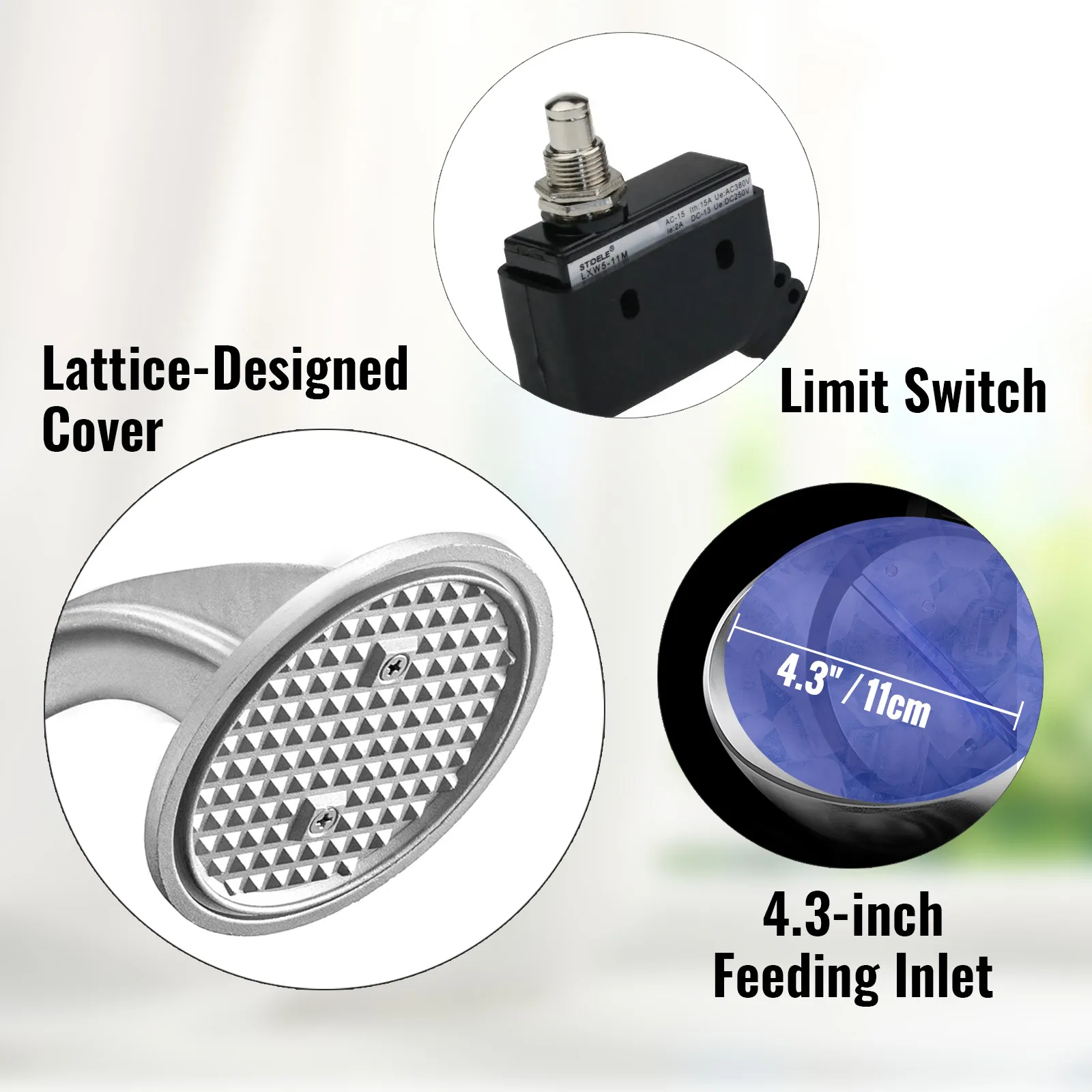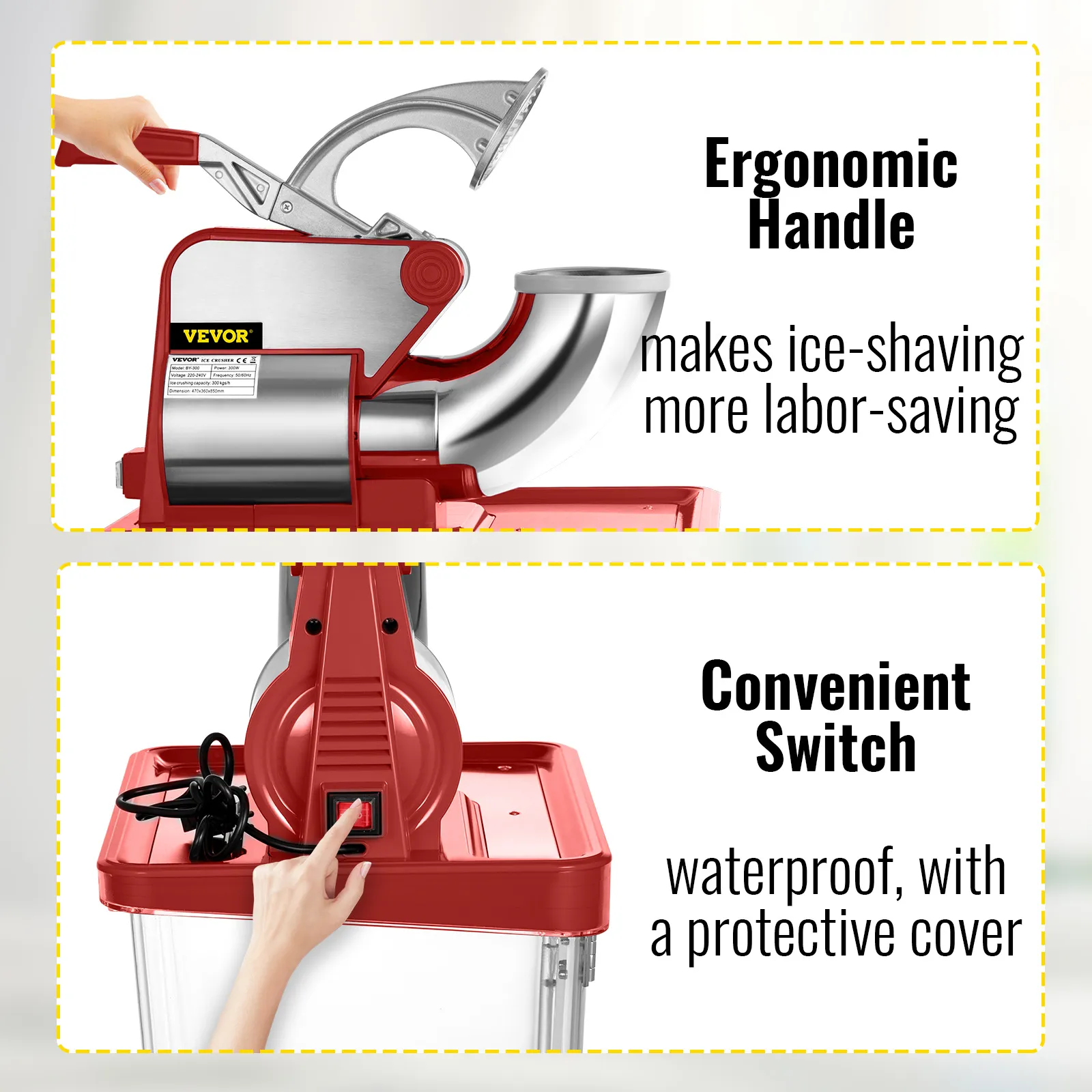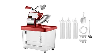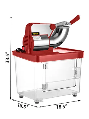 Pressing the handle can advance the speed of crushing ice. A limit switch is included (the snowball machine will only start running when the handle reaches a certain position). The lattice prevents splashing.