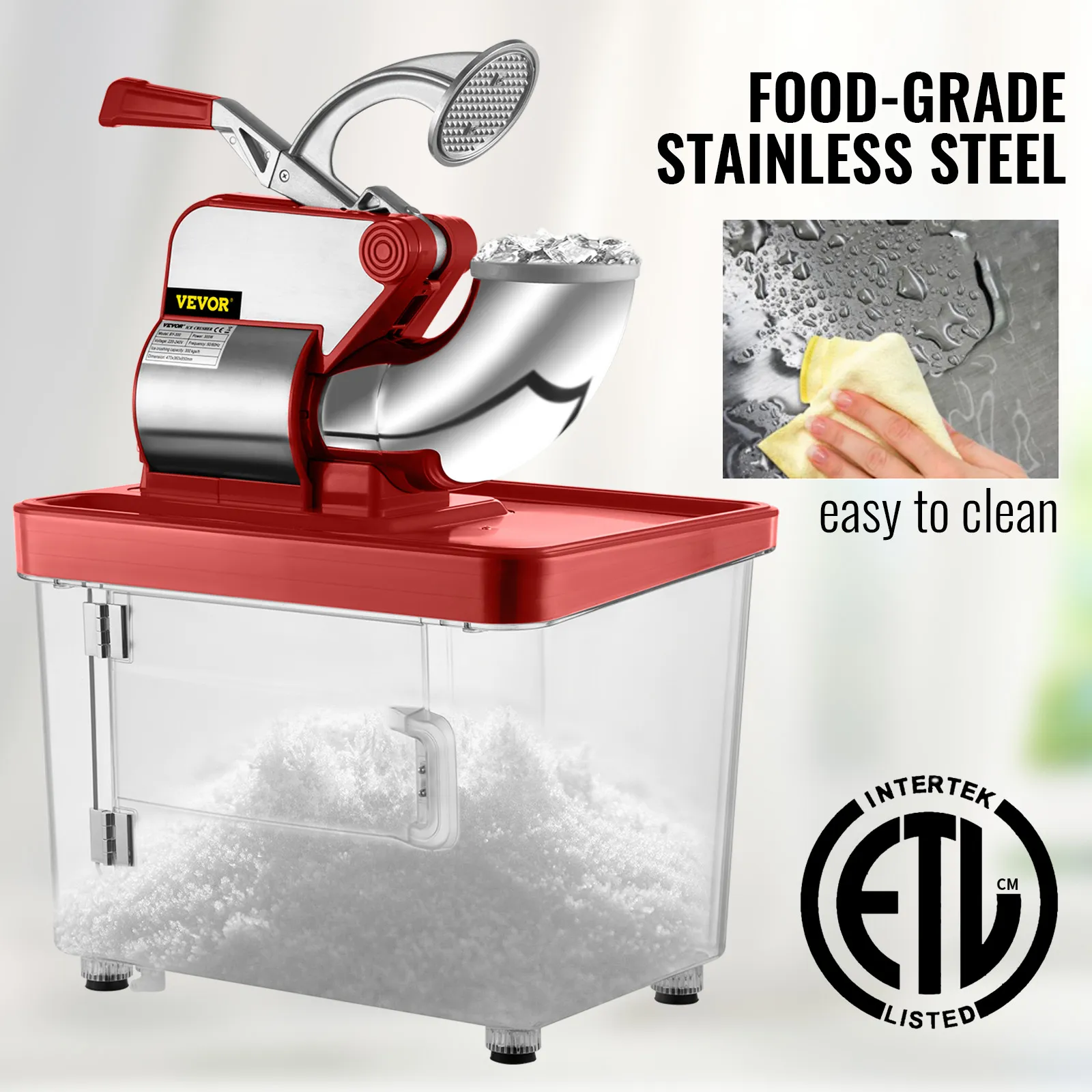 This ice shaver is built with food-grade stainless steel hopper and blades with thickened PC material ice storage box, featuring non-slip rubber feet. All material is sanitary and healthy. It is ETL certified.