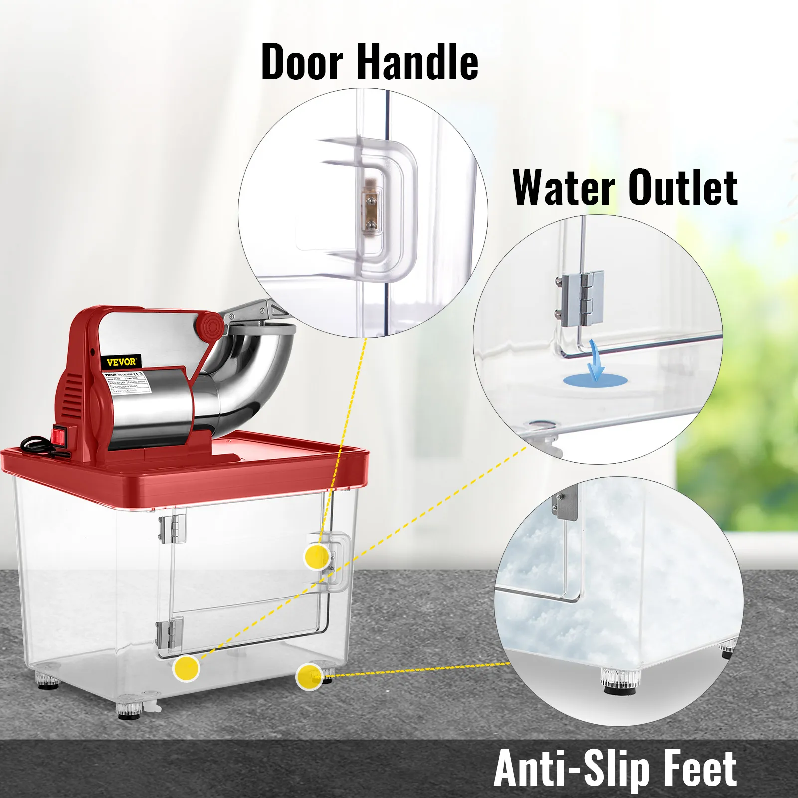 It comes with a 9 gal (34L) one-piece injection-molded storage box. The PC housing keeps the shaved ice cool, and drain hole with the pipe for releasing the ice water. The clip-on door adopted for enhanced sealing ability.