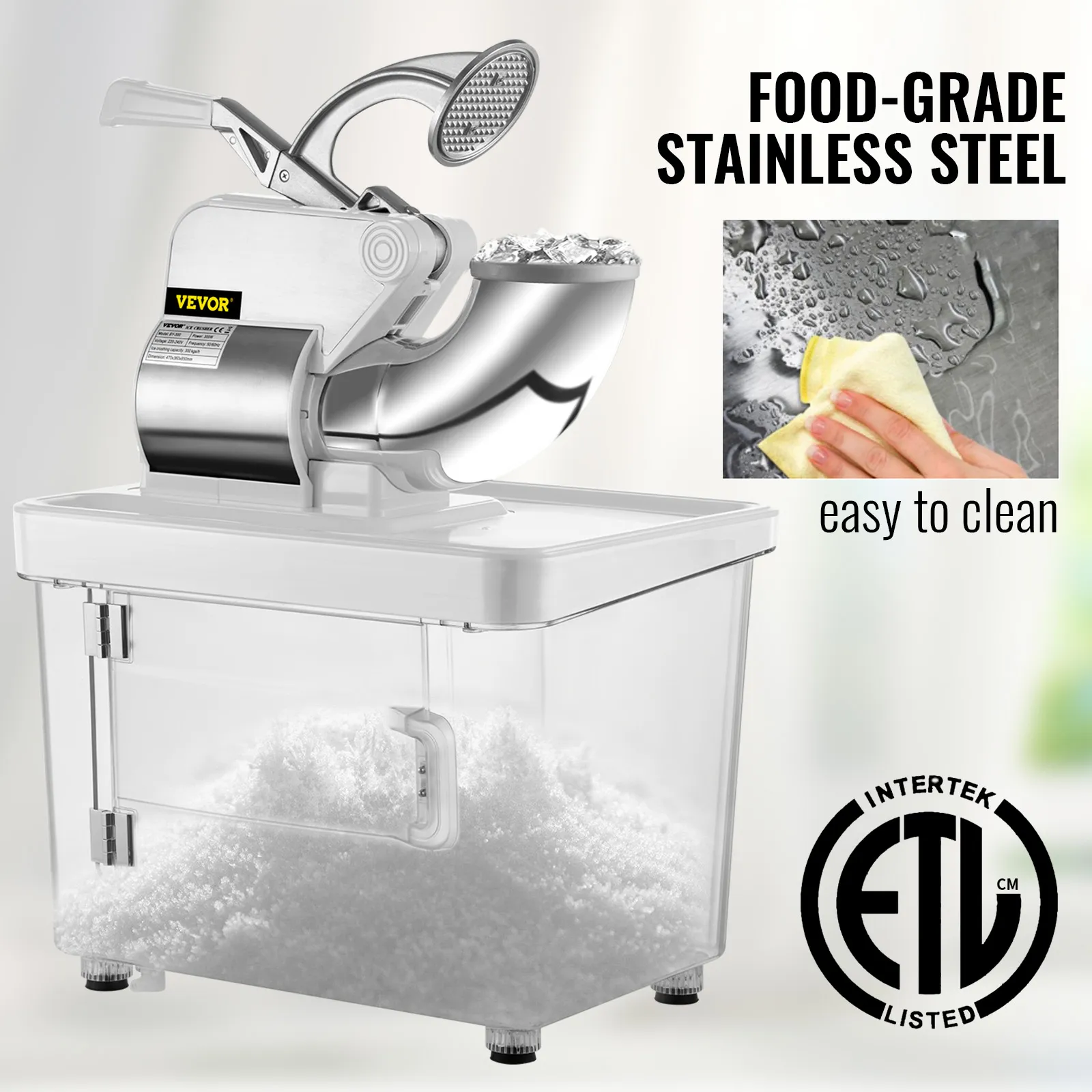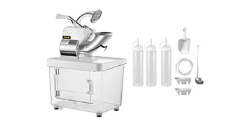 This ice shaver is built with food-grade stainless steel hopper and blades with thickened PC material ice storage box, featuring non-slip rubber feet. All material is sanitary and healthy. It is ETL certified.