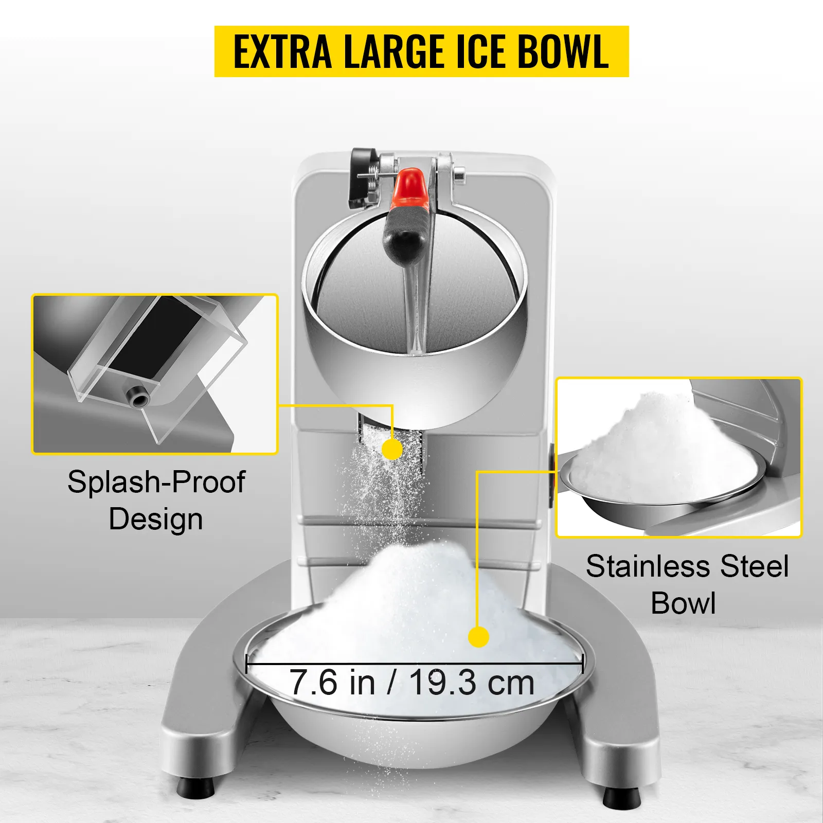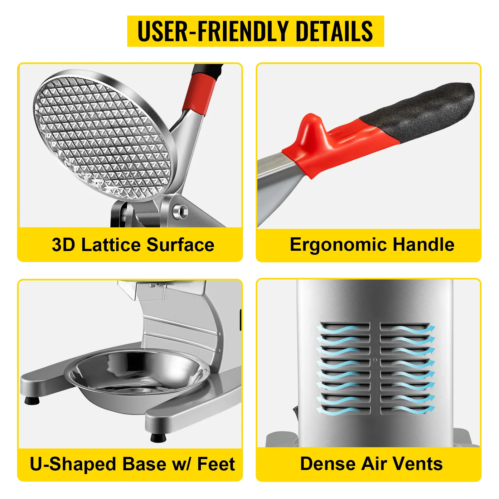 The disc fits the ice inlet perfectly, effectively avoiding ice chips from splashing. A non-skid sleeve is wrapped on the end of the labor-saving handle. The U-shaped base with rubber feet can enhance the stability of the machine. And the dense air vents for heat dissipation is for extending the motor's service life.