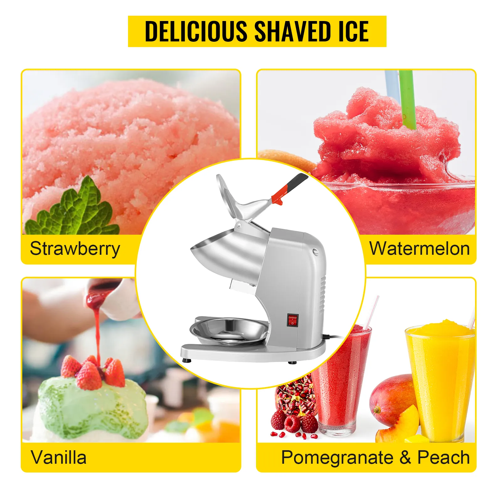 Our electric ice shaver features an eyes-pleasing appearance and powerful performance. With the built-in 300W copper motor, it can crush 95 kg (210 lbs) of ice each hour, providing you with soft, fluffy, and powdery snow ice and meeting your demands in a relatively short time. Considerate design details and accessories are also integrated, such as the practical ice bowl, splash-proof ice outlet, ergonomic handle, U-shaped base with non-skid feet, dense air vents, etc. It is perfect for restaurants, canteens, bars, cafés, snack stands, etc.