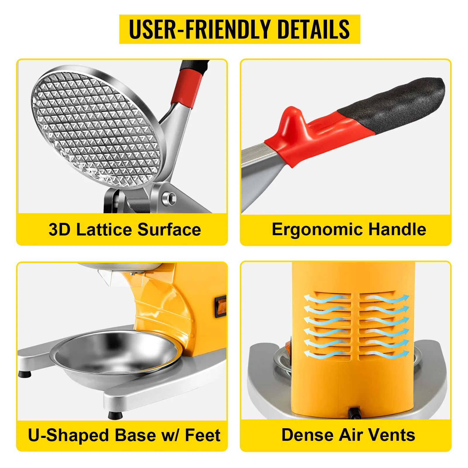 The disc fits the ice inlet perfectly, effectively avoiding ice chips from splashing. A non-skid sleeve is wrapped on the end of the labor-saving handle. The U-shaped base with rubber feet can enhance the stability of the machine. And the dense air vents for heat dissipation is for extending the motor's service life.