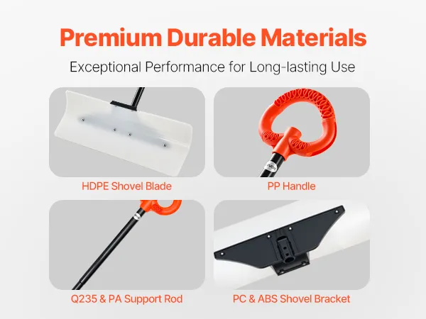Crafted with premium HDPE for the shovel blade, reinforced PP handle, Q235 & PA support rods, and a durable PC & ABS frame, this winter shovel is designed to withstand harsh environments and maintain exceptional performance over time.