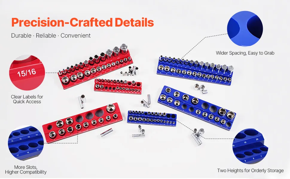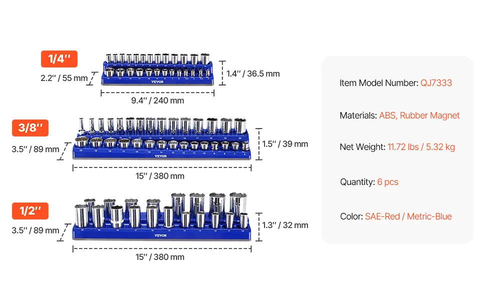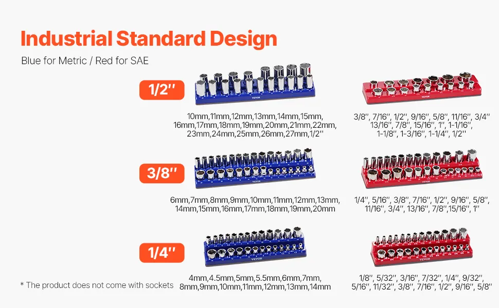 Professional Design: Our socket organizer holders feature 2 colors: blue for metric and red for SAE. The set includes 143 slots, suitable for SAE sizes from 1/8" to 5/8" (1/4" drive), 1/4" to 1" (3/8" drive), and 3/8'' to 1-1/4'' with a 1/2'' drive adapter (1/2'' drive); metric sizes from 4 to 14mm (1/4" drive), 6 to 20mm (3/8" drive), and 10 to 27mm with a 1/2'' drive adapter (1/2'' drive).